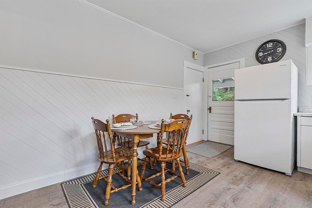 This inviting breakfast nook showcases a charming circular table surrounded by classic wooden chairs, perfect for family gatherings or casual meals. The light gray walls with diagonal paneling create a warm, yet modern ambiance, while the natural wood tones of the furniture add a touch of rustic charm. A large window allows ample sunlight to flood the space, enhancing the cheerful atmosphere. The sleek white refrigerator and minimalist design elements contribute to a clean and organized look. A stylish clock adorns the wall, ensuring you never lose track of time during those delightful breakfasts with loved ones.