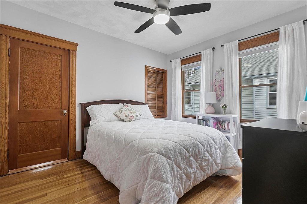 This inviting bedroom features a warm, rustic charm highlighted by beautiful wooden accents, including a rich grain door and window trims. A comfortable queen-sized bed, adorned with a textured white comforter and floral accent pillows, invites relaxation. Large windows adorned with sheer curtains allow natural light to flood the space, creating a bright and airy atmosphere. A sleek bedside table holds a soft lamp, enhancing the cozy ambiance. The light gray walls pair harmoniously with the honey-toned hardwood floors, while the modern ceiling fan adds both style and functionality, ensuring comfort year-round. This room offers a perfect blend of comfort and elegance.