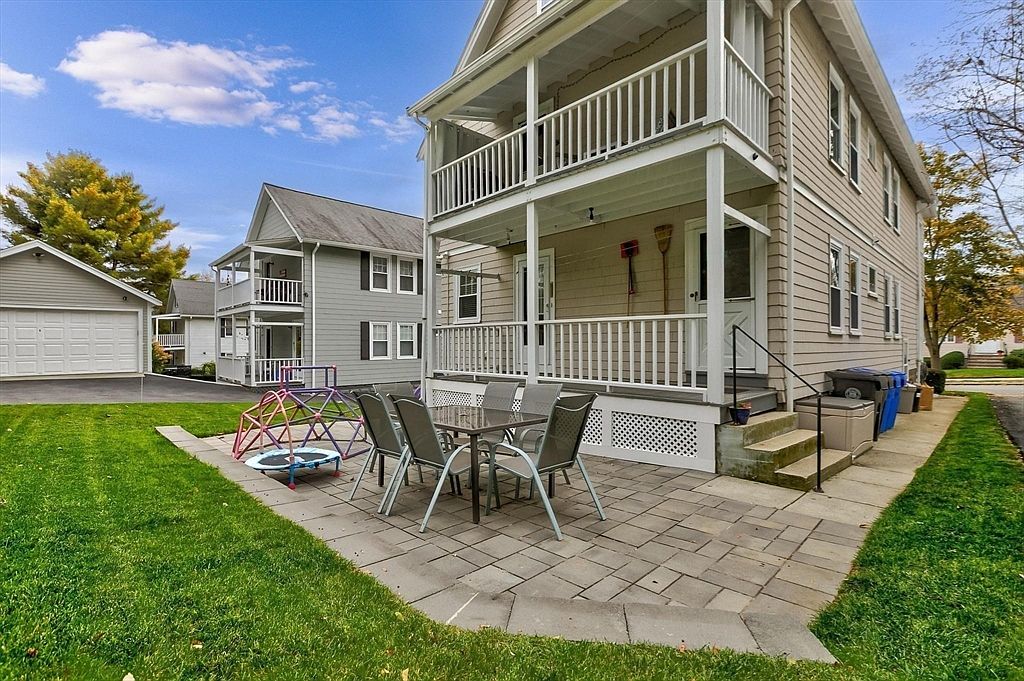 This inviting backyard patio features a well-designed outdoor entertainment space, perfect for family gatherings. The square paver stones create a sturdy foundation for a circular dining table surrounded by modern chairs, ideal for al fresco meals. The lush green lawn invites play and relaxation, complemented by a colorful playset in the corner, making it child-friendly. White railings enhance the two-story home’s charm, while large windows adorn the façade, allowing natural light to flood into the interior. The subtle gray siding harmonizes with crisp white accents, reinforcing a fresh, contemporary aesthetic, ideal for enjoying cozy evenings outdoors.