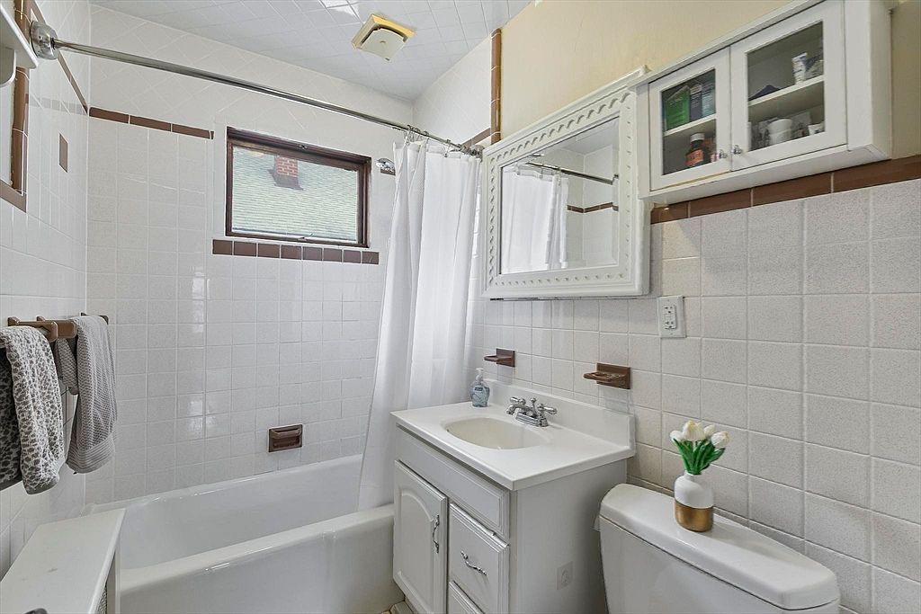 This inviting bathroom showcases a well-thought-out layout, blending function and elegance. The bright white tiles contrast beautifully with rich wooden accents, creating a timeless appeal. A spacious bathtub invites relaxation, while the modern vanity offers ample storage and convenience. Natural light filters through a thoughtfully placed window, enhancing the airy atmosphere. Family-friendly features include a shower with a curtain for easy access and a sleek sink with a practical design. The decorative mirror adds a touch of charm, while the neatly arranged toiletries and fresh flowers on display elevate the overall aesthetic, making this a serene retreat in the home.