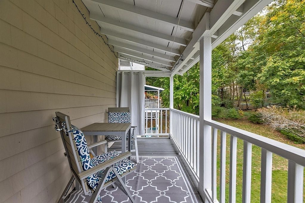 This inviting balcony features a relaxing layout with a cozy seating arrangement ideal for morning coffee or evening relaxation. The light-colored wooden railing and siding, combined with the modern gray flooring, create a serene ambiance. Enhancing the comfort, stylish blue and white patterned cushions adorn the chairs, while a matching area rug adds a touch of elegance. Overhead, the exposed beams of the sloped roof offer a touch of architectural charm, providing shade while allowing natural light to filter through. Surrounded by lush greenery, this outdoor space invites family connection and peaceful moments amidst nature.