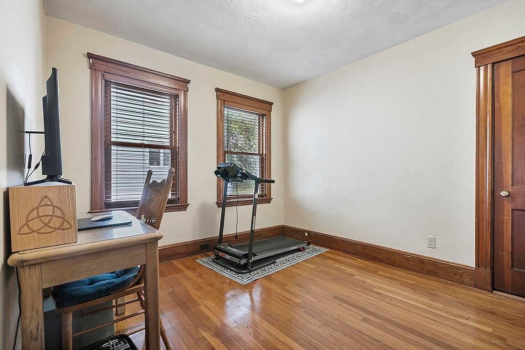 This dedicated home gym space features a seamless blend of functionality and comfort. Natural light spills in through double-hung windows adorned with wooden blinds, while rich, warm-toned hardwood flooring invites a cozy atmosphere. A treadmill occupies the center, ideal for daily workouts, complemented by a stylish area rug that adds a touch of design flair. A small wooden desk, enhanced with a plush chair, provides a perfect spot for post-workout relaxation or productivity. The soft cream walls contrast beautifully with the dark wood trim and door, creating an inviting and motivating environment for exercise.