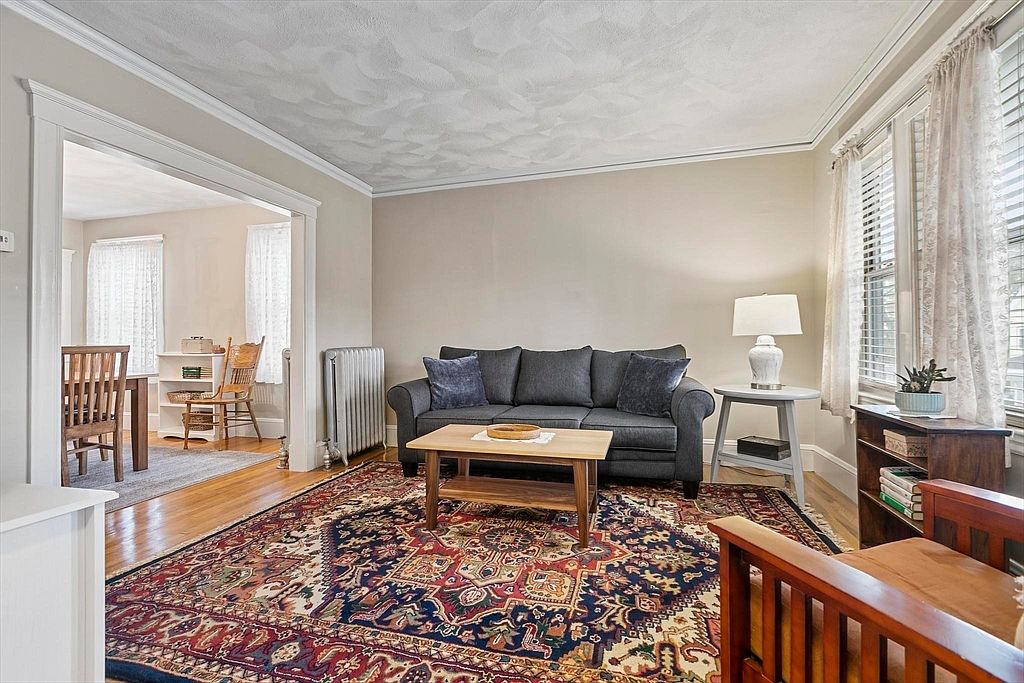 This inviting living space features a harmonious blend of comfort and elegance. Warm beige walls complement the plush dark gray sofa, adorned with soft pillows, offering a perfect lounge spot. A richly patterned area rug anchors the room, adding warmth and character. Natural light floods in through large windows, enhancing the airy feel. The cozy radiator provides warmth, while the modern side tables and an elegant lamp contribute to a relaxed atmosphere. Open to a dining area, this layout promotes easy interaction, making it ideal for family gatherings. Simple yet stylish decor embodies a welcoming home vibe.