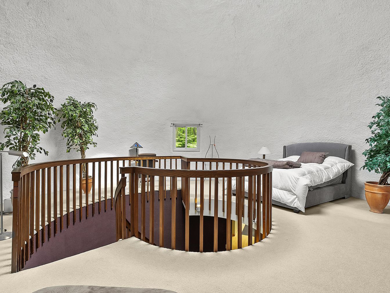 This inviting master loft features a unique circular design, enhancing the sense of openness and elegance. Floor-to-ceiling white walls paired with plush beige carpeting create a warm atmosphere. The wooden railing encircling the staircase adds a touch of rustic charm while ensuring safety. A cozy gray bed adorned with soft linens invites relaxation, complemented by tasteful decorative pillows. Nearby, decorative plants infuse life and color, enhancing the tranquil aesthetic. Large windows allow natural light to flood the space, providing stunning views of the greenery outside. This design is perfect for family gatherings or peaceful retreats.