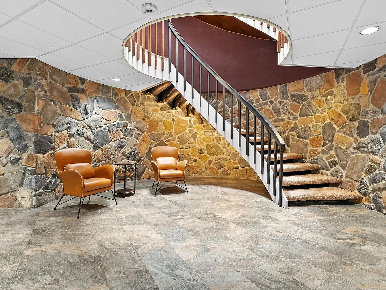 This inviting basement entryway combines rustic charm with modern elegance. The stunning stone wall adds texture and warmth, creating a welcoming atmosphere. A stylish spiral staircase draws the eye upward, featuring rich wooden steps and a sleek metal railing. Two contemporary, tan leather armchairs flank a minimalist side table, offering a cozy space for conversation or relaxation. The natural stone flooring enhances the earthy feel, while recessed lighting ensures the area remains bright and airy. This design is perfect for family gatherings or as a private retreat, blending comfort with sophisticated aesthetics.