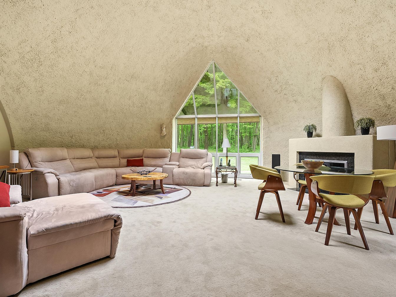 This inviting living area features a striking vaulted ceiling that enhances its open ambiance. Soft beige walls and plush carpeting create a cozy atmosphere, while large triangular windows flood the space with natural light and showcase the serene outdoor landscape. The sectional couch, upholstered in a light fabric, offers ample seating for family and friends, accented by vibrant throw pillows. A unique wooden coffee table adds warmth, paired with stylish dining chairs that incorporate playful colors. A modern fireplace serves as a focal point, combining comfort and sophistication, making this space perfect for relaxation and social gatherings.