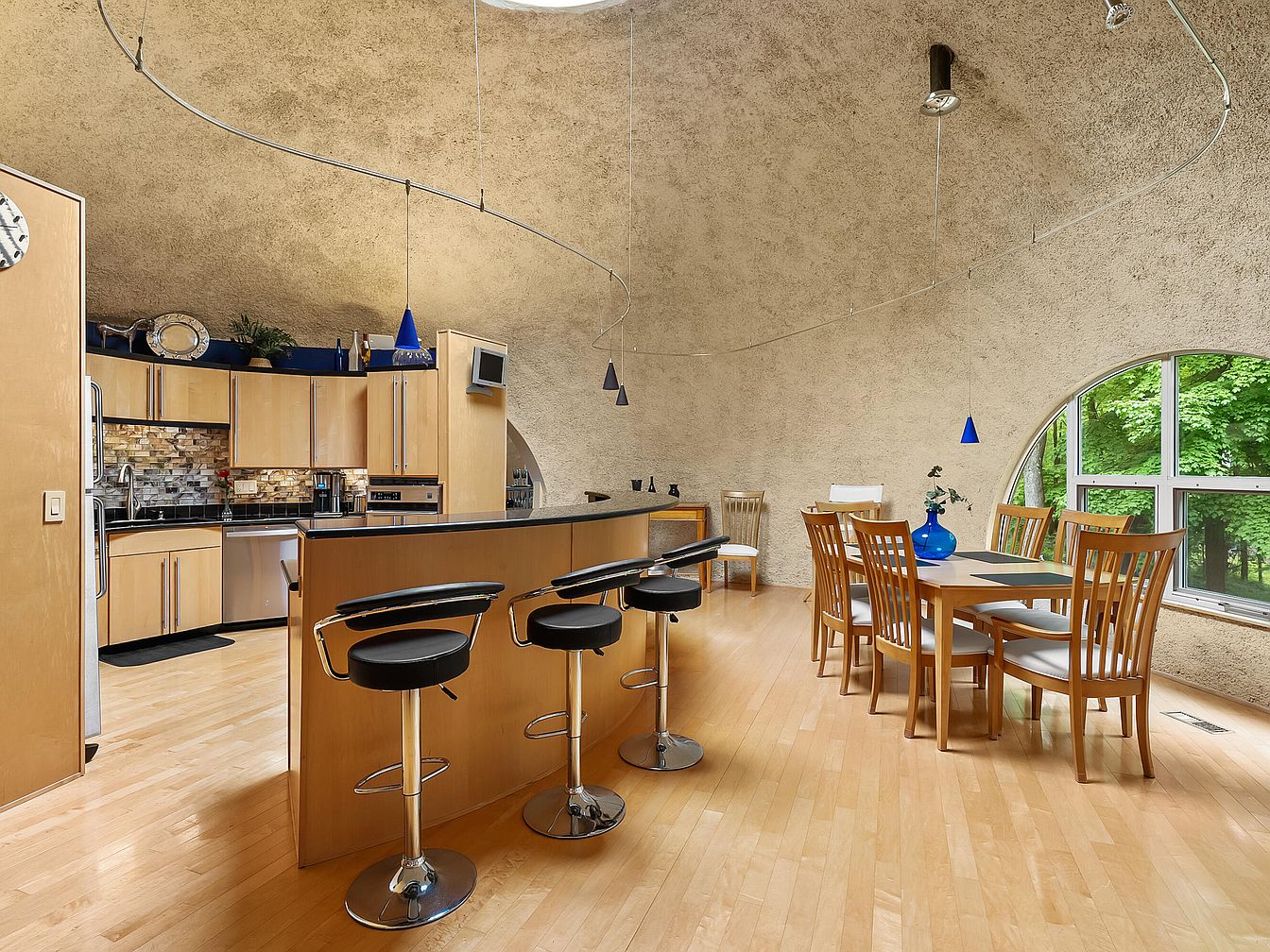 This inviting modern kitchen features sleek wood cabinetry and a spacious island with stylish bar seating, perfect for family gatherings. The warm, neutral color scheme is complemented by a striking backsplash of multicolored tiles, enhancing the space’s contemporary feel. Large windows flood the area with natural light, inviting the lush greenery outside into the atmosphere. The rounded ceilings add an architectural flair, while pendant lights in vivid blue provide artistic accents. A dining area nearby is ideal for casual meals, equipped with elegantly designed wooden chairs that blend comfort and style, fostering an open, family-friendly environment.