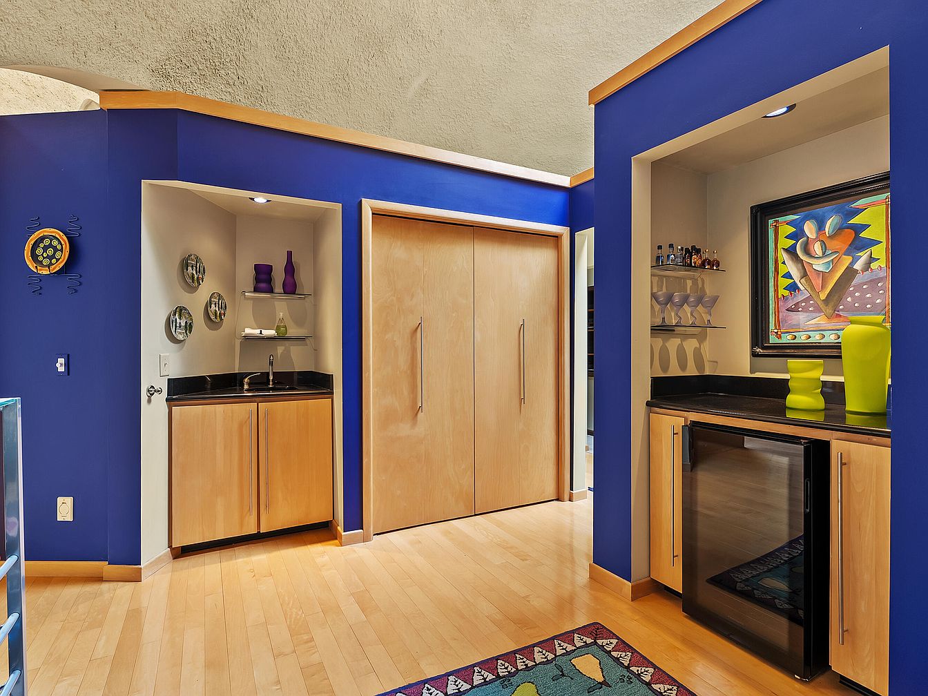 This vibrant home bar features a captivating blue accent wall that energizes the space. Sleek cabinetry in a warm wood tone complements black countertops, creating a stylish contrast. A mini-fridge ensures convenience for entertaining, while thoughtful shelving displays decorative glassware. Family-friendly elements include open spaces that encourage interaction. Artistic touches like colorful vases and a framed modern painting add personality, reflecting a playful aesthetic. Natural light filters through, enhancing the inviting atmosphere. The layout promotes a seamless flow between the bar area and adjoining spaces, perfect for gatherings or a casual evening at home.