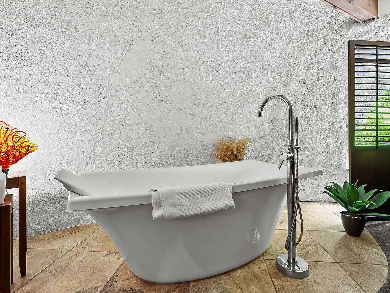 This serene bathroom features a striking freestanding tub, inviting relaxation with its sleek curves and modern design. The earthy color palette incorporates soft natural tones with warm beige tile flooring complementing the textured white walls, creating a spa-like ambiance. Natural light pours in through the wooden slatted window, bringing the outdoors inside. A stylish floor-mounted faucet adds a touch of contemporary elegance, while minimalist decor, including a potted plant, enhances the calming atmosphere. Thoughtful details, such as the plush towel neatly draped over the tub, ensure this space is both functional and family-friendly, perfect for unwinding after a long day.