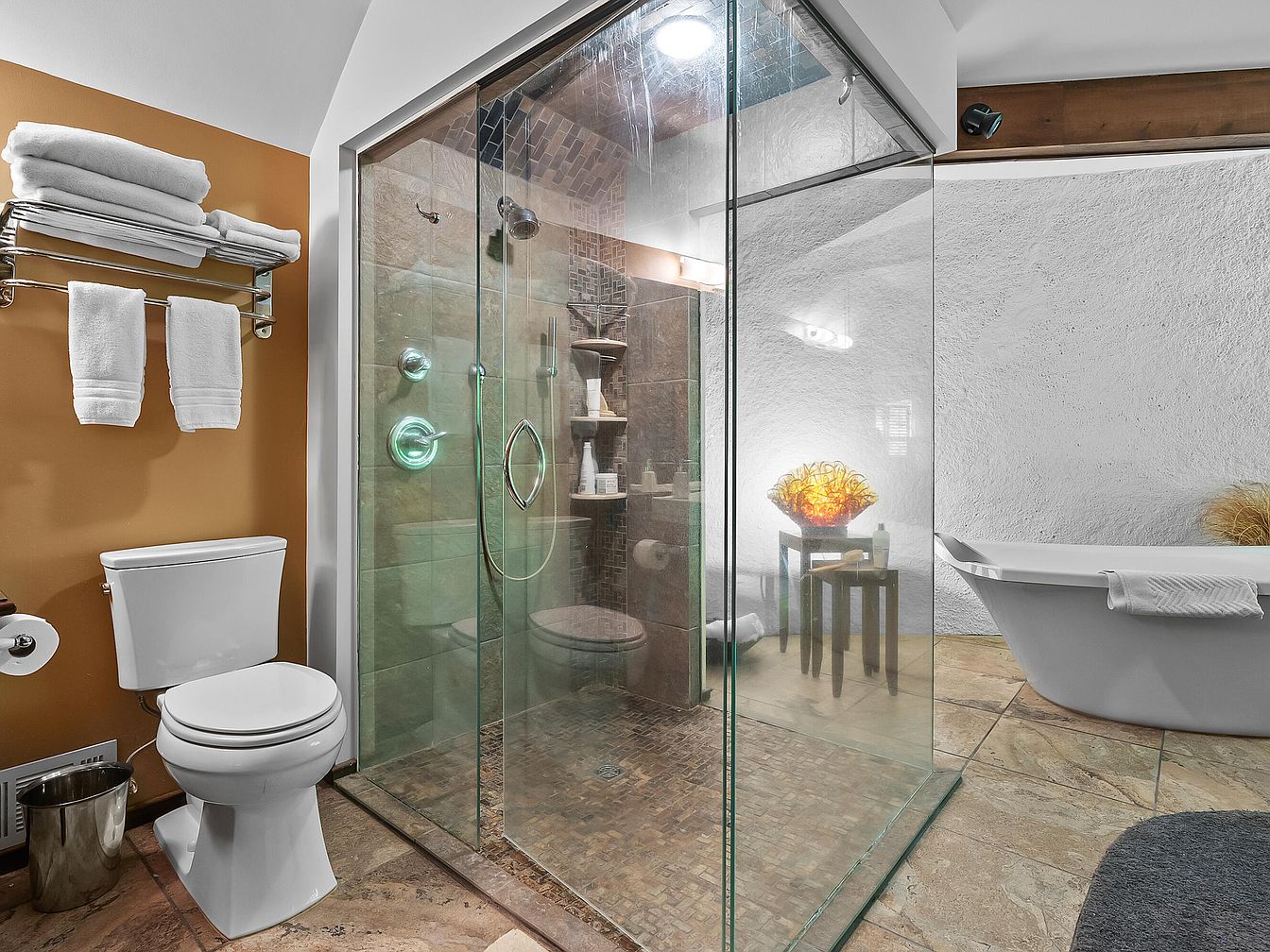 This inviting bathroom features a sleek and modern layout, highlighted by a glass-enclosed shower that offers an open feel. A warm, earthy orange accent wall complements the natural stone tiles, creating a cozy atmosphere. The freestanding tub serves as a luxurious centerpiece, perfect for relaxation. Thoughtfully arranged amenities include fluffy white towels and essential toiletries on display, enhancing convenience. The metallic fixtures add a contemporary touch while the elegant lighting complements the overall aesthetic. A small table with decorative accents further elevates the space, making it both functional and visually appealing for family use.