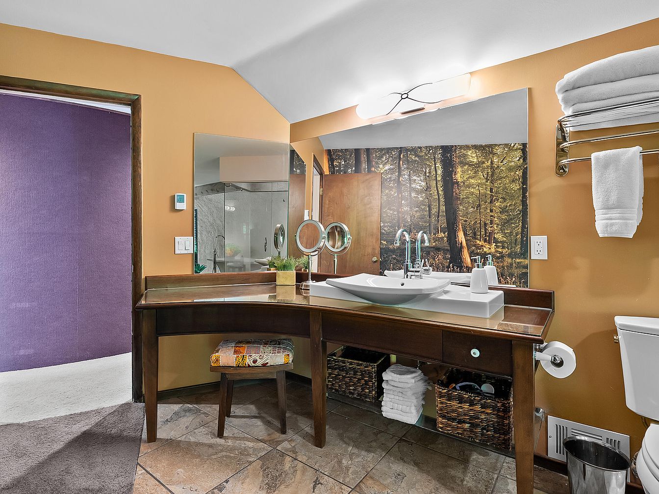 This bathroom blends contemporary elegance with warm, earthy tones. The unique curved vanity is crafted from rich brown wood, featuring a sleek countertop and an eye-catching vessel sink, creating an inviting space for family use. A large wall mirror enhances light and opens up the room, while a nature mural creates a serene backdrop. Textured tiles in various shades complement the walls, with a plush area rug providing comfort. Functional shelving and wicker baskets add both storage and warmth. With thoughtfully chosen lighting and a pop of color from the purple accent wall, this bathroom is both stylish and practical.