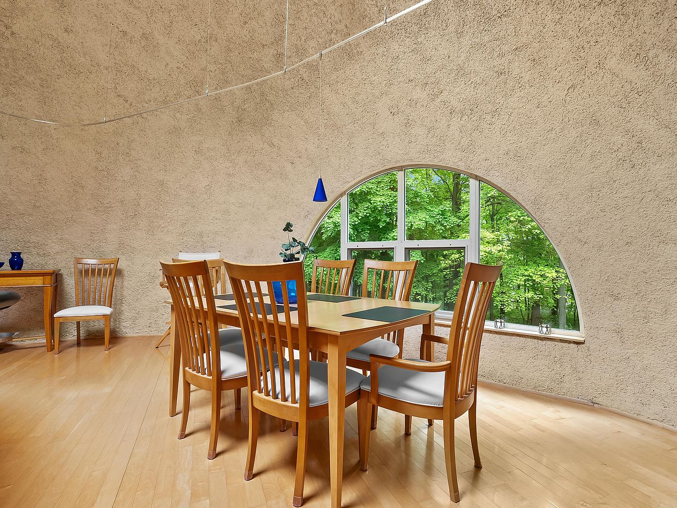 A spacious dining room awaits, featuring an elegant wooden table surrounded by high-backed chairs, offering ample seating for family gatherings. The unique curved walls add character and enhance acoustics, while large arched windows flood the space with natural light, showcasing lush greenery outside. A warm, neutral color palette creates a cozy atmosphere, complemented by light hardwood flooring. The simple yet stylish decor includes a decorative blue vase and subtle pendant lighting, emphasizing modern elegance. This inviting space not only promotes family bonding but also harmonizes indoor comfort with the beauty of nature, making every meal a delightful experience.