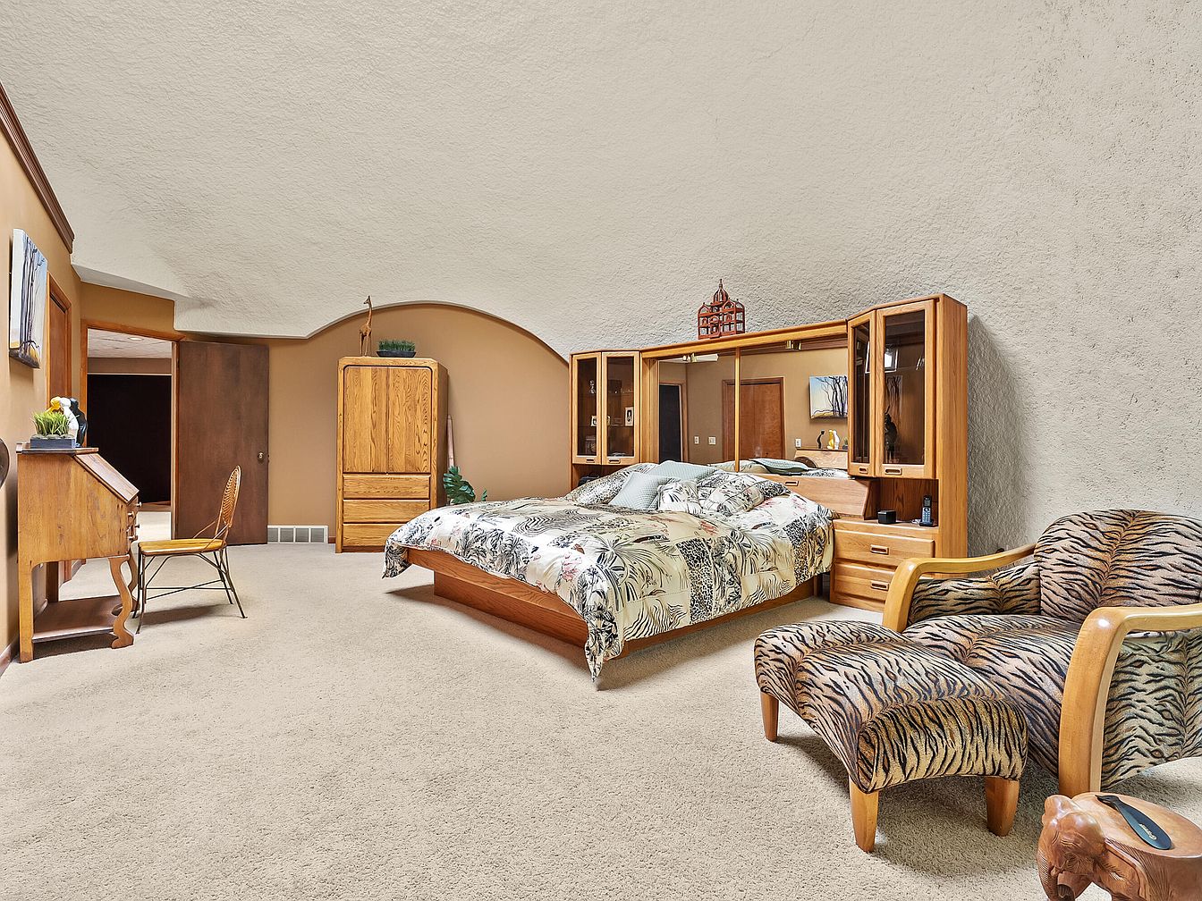 This spacious master bedroom features a unique vaulted ceiling that enhances the feeling of openness and light. The warm, earthy color palette of taupe and beige creates a cozy atmosphere, complemented by the plush beige carpet. A king-sized bed with a vibrant botanical print duvet serves as the centerpiece, while elegant wooden furniture adds a touch of warmth. The sleek mirrored wardrobe cabinets provide functional storage, paired with a charming desk and vintage chair for workspace needs. A stylish patterned accent chair invites relaxation, making this room a perfect family retreat that balances comfort and aesthetic appeal.