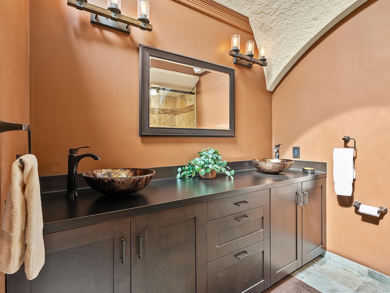 This elegantly designed bathroom features a spacious double vanity topped with a sleek black countertop, showcasing two stunning vessel sinks that add a touch of sophistication. The earthy brown walls complement the rich walnut cabinetry, creating a warm and inviting atmosphere. The stylish wall-mounted lighting illuminates the space while enhancing the architectural details, including the arched ceiling that adds height and character. Thoughtfully placed greenery introduces a fresh, organic element, perfect for creating a spa-like retreat within the home. With practical storage solutions and a luxurious design, this bathroom seamlessly blends functionality with aesthetic appeal.