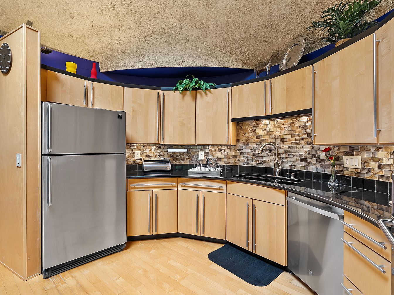 This modern kitchen features a sleek layout with curved cabinetry, maximizing space efficiency while maintaining an open feel. The combination of light maple wood and dark granite countertops creates a striking contrast, accentuated by the eye-catching mosaic backsplash. Stainless steel appliances, including a spacious fridge and dishwasher, add a contemporary touch. Ample storage is provided by generously sized cabinets, perfect for a family’s culinary needs. A soft, ambient ceiling light enhances the room’s inviting atmosphere, while the vibrant decorative elements introduce a playful appeal. A harmonious blend of function and style makes this kitchen both practical and aesthetically pleasing.