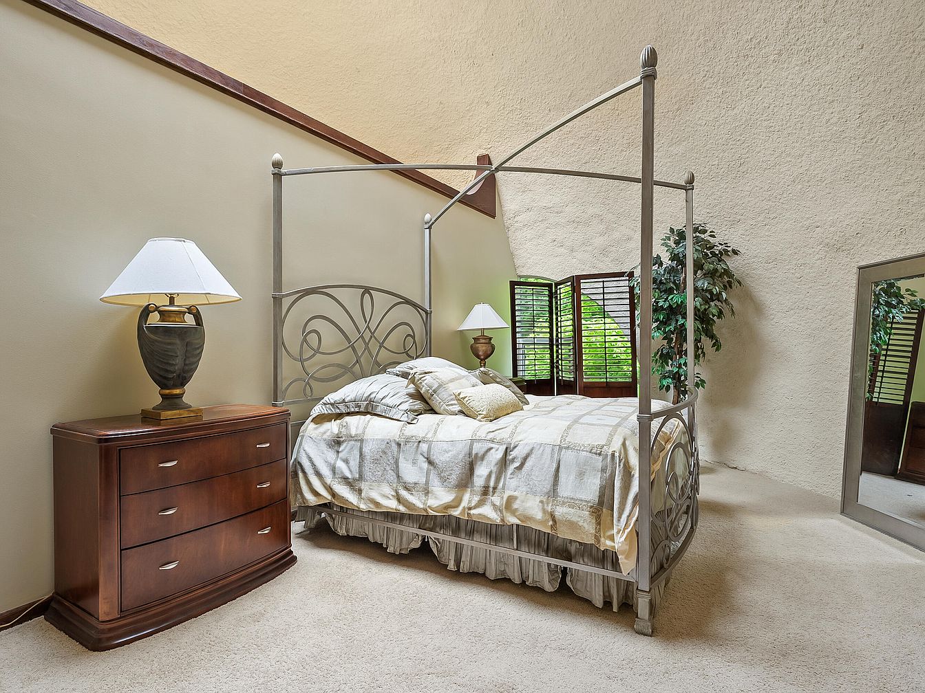 This serene master bedroom features a spacious layout accentuated by high ceilings and natural light. A stylish metal canopy bed takes center stage, accompanied by soft, muted bedding that complements the warm color palette of creamy walls and beige carpeting. A wooden nightstand with a decorative lamp enhances the cozy atmosphere, while elegant vertical blinds on the window offer both privacy and an inviting view. The mirrored accent adds depth, reflecting the tasteful decor, including a lush green plant that introduces a touch of nature. This welcoming space promises comfort and tranquility, ideal for relaxation.