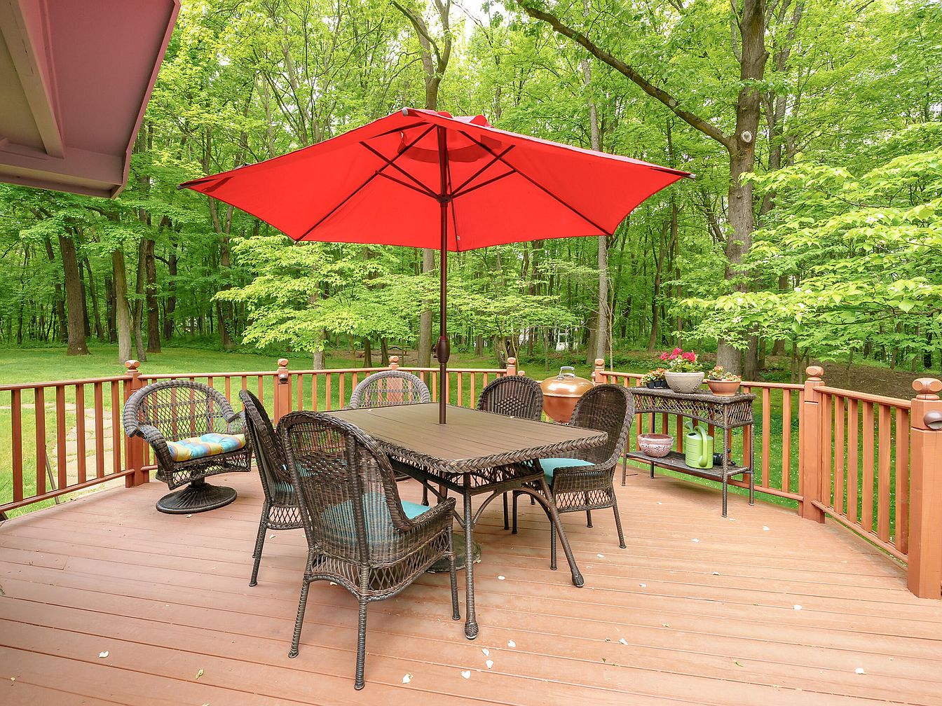 This inviting outdoor dining space features a spacious wooden deck embraced by lush greenery, offering tranquility and privacy. A robust rectangular table is surrounded by comfortable wicker chairs, each adorned with vibrant cushions. A large red umbrella provides ample shade, enhancing the space’s appeal for al fresco meals. Decor elements include potted plants on a stylish iron rack and subtly placed gardening tools, showcasing a harmonious blend of function and aesthetics. The warm wooden tones of the deck, combined with the vibrant colors of the umbrella and cushions, create an inviting environment perfect for family gatherings and outdoor entertaining.