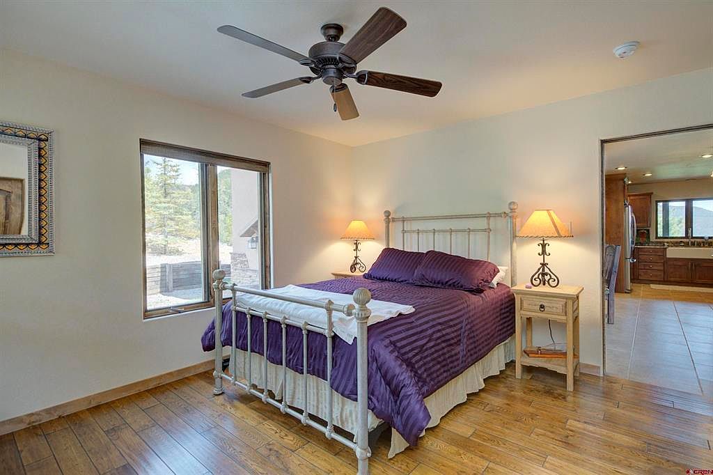 A warm and inviting bedroom merges traditional charm with modern comforts, featuring hardwood flooring and cream-colored walls that create a serene atmosphere. A classic metal bed frame with deep purple bedding anchors the space, flanked by two natural wood nightstands topped with decorative metal lamps. Large windows fill the room with natural light, framing views of the surrounding nature and providing ample sunshine. The ceiling fan ensures optimal airflow, making the space both cozy and practical for family life. An open doorway leads seamlessly to the adjacent kitchen area, promoting a feeling of connectivity and openness throughout the home.