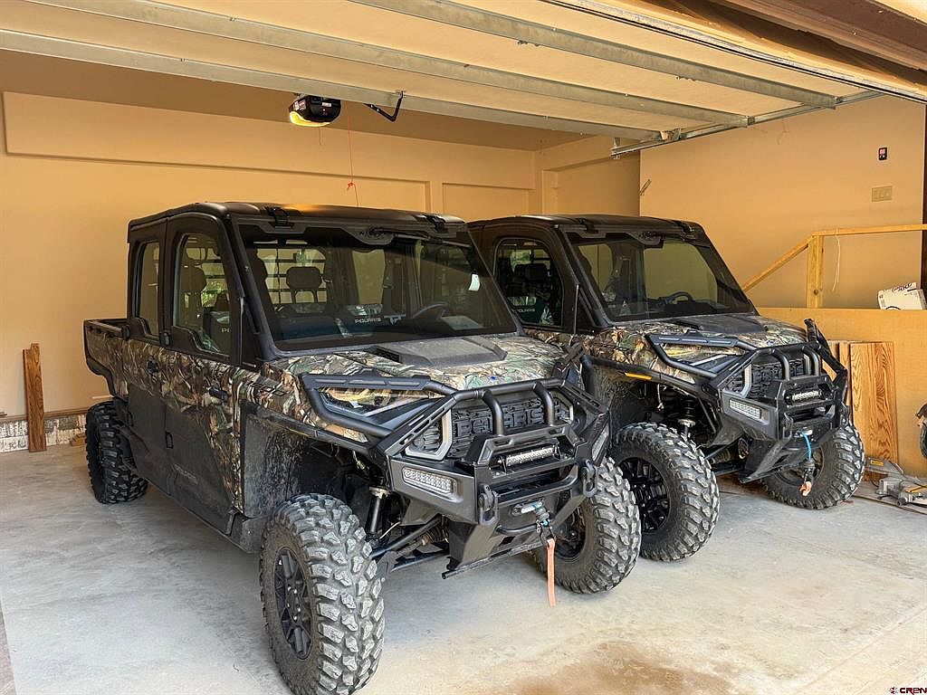 Spacious garage featuring an open layout with smooth concrete flooring suitable for easy parking and maneuvering. The uncluttered space is large enough to accommodate multiple vehicles, illustrated here with two rugged off-road utility vehicles, making it ideal for active families who love outdoor adventures. Neutral tan walls create a warm, inviting backdrop, complemented by a high automatic garage door for convenience. Simple built-in shelving along the side offers functional storage options for tools or sports gear, promoting family organization. The robust design, ample space, and practical layout make this garage perfect for both everyday use and recreational hobbies.