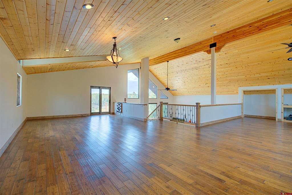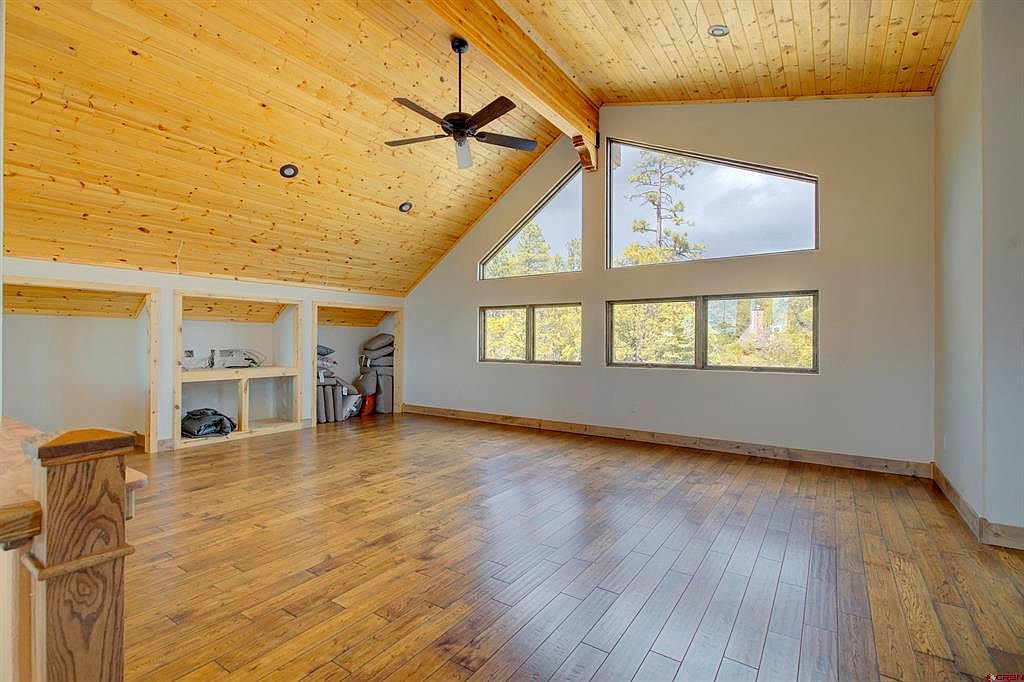 A spacious loft living area featuring rich wood flooring and a vaulted, pine-paneled ceiling, enhanced by a modern ceiling fan. Large, geometric windows let natural light flood the space, creating a warm and airy atmosphere while highlighting stunning outdoor views. The open layout offers flexibility for a variety of family activities, from play space to relaxation or hobbies. Recessed nooks along the wall provide clever built-in storage or desk areas—ideal for staying organized or fostering creativity. Neutral wall tones blend seamlessly with wood details for a cozy, inviting aesthetic that suits both contemporary and rustic styles.