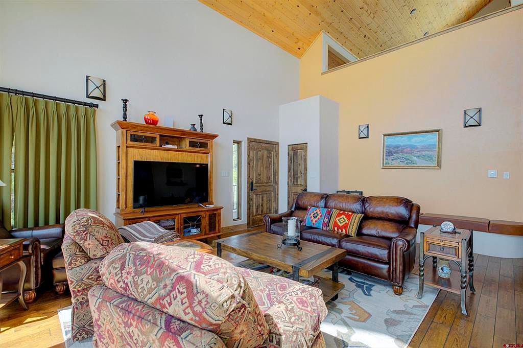 Warmth and comfort define this inviting living room, where high vaulted wood ceilings and a sunbathed open layout create a welcoming retreat for all ages. The space features a mix of textures with a plush patterned armchair, rich leather seating, and rustic wooden tables. Earthy tones, from the olive-green drapes to the soft peach accent wall, blend seamlessly for a natural, family-friendly atmosphere. Cozy, southwestern-inspired cushions add color and personality. The entertainment center, wood trim doors, and thoughtfully placed artwork offer both functional storage and visual interest, making this an ideal gathering space for relaxation and connection.