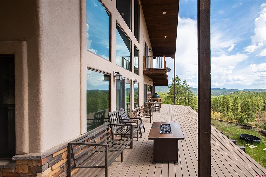 Spacious wrap-around deck features panoramic views of lush forests and distant mountains, creating a tranquil outdoor retreat perfect for family gatherings. The design includes durable wood-look flooring, modern iron benches, a cozy rectangular fire pit centerpiece, and floor-to-ceiling windows that brighten the living spaces indoors. Earth-toned stucco walls paired with stone accents and dark wood trim offer a warm, contemporary feel. Overhead balconies provide an extra layer of visual interest while also serving as shaded nooks. This deck encourages relaxation and socializing, blending seamlessly with nature while ensuring safety and comfort for all ages.