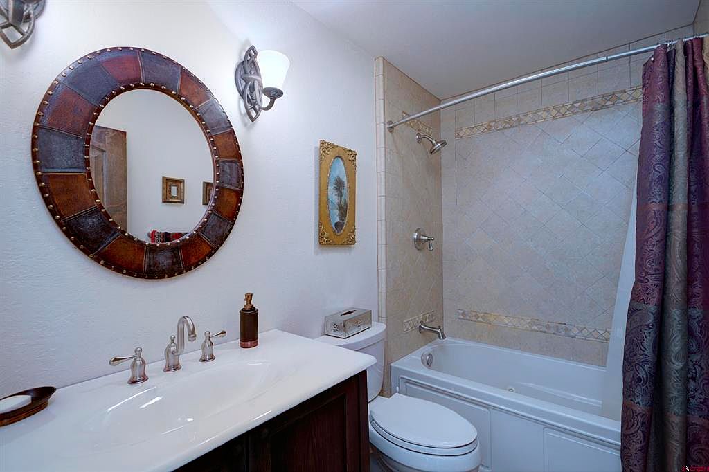 A welcoming bathroom layout features a large vanity with a smooth white countertop, accented by a bold, round mirror encased in a rustic, leather-trimmed frame. Soft white walls and overhead lighting create a bright and clean environment, while warm wood tones from the cabinetry add a touch of coziness. The bathtub and shower combination is highlighted by neutral ceramic tiles with decorative borders, accompanied by an elegant, earth-toned shower curtain. Family-friendly features include a spacious countertop, easy-to-reach fixtures, and a compact layout ideal for children and adults alike. Subtle art and classic hardware contribute to a timeless, inviting feel.