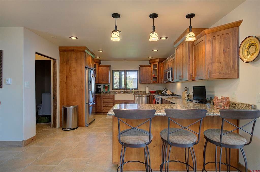 Warm natural wood cabinetry and gleaming granite countertops create a welcoming kitchen and social hub, perfect for family gatherings and casual meals. The open layout features a large peninsula with comfortable seating for three, making it ideal for kids to do homework while meals are prepared or for guests to chat. Stainless steel appliances provide a modern touch, while under-cabinet lighting and pendant lamps offer inviting ambiance. The neutral color palette, accented with earth-toned backsplash and tile flooring, complements the rustic wood details, blending comfort and functionality for a true family-friendly culinary space.