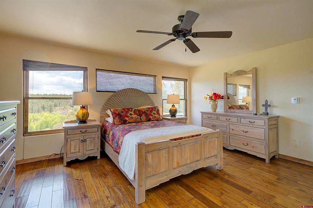 A serene and spacious master bedroom features large windows that fill the room with natural light and offer peaceful views of the outdoors. Natural wood furniture, including a solid bed frame, matching dressers, and nightstands, add warmth and a rustic charm to the space. Soft cream walls and honeyed wood floors create a cozy, family-friendly atmosphere, while a ceiling fan provides year-round comfort. The bedding adds a pop of color with its patterned red and gold design, complemented by plush pillows. Decorative lamps and fresh flowers on the dresser enhance the inviting and homey feel of this restful haven.