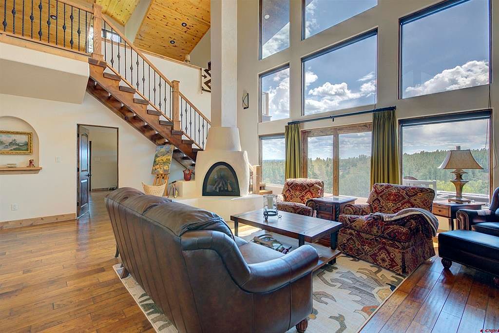 A spacious living room with soaring ceilings opens up to impressive floor-to-ceiling windows, bringing abundant natural light and scenic views of the outdoors. The design combines rustic and contemporary elements, from exposed wood beams and a tongue-and-groove ceiling to a grand kiva-style fireplace anchoring the space. Comfortable leather and patterned fabric seating offer plenty of room for family gatherings, while a large wooden coffee table sits atop a cozy area rug. Thoughtful touches like the iron-railed staircase and warm wood floors inject both charm and functionality, making it a welcoming hub for relaxation and togetherness.