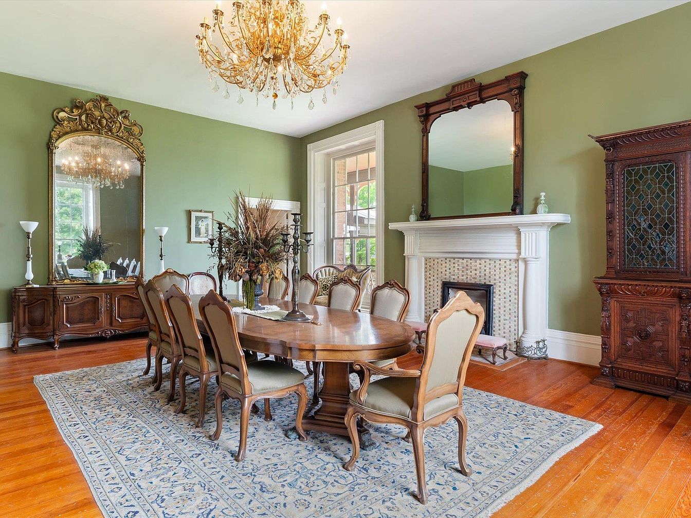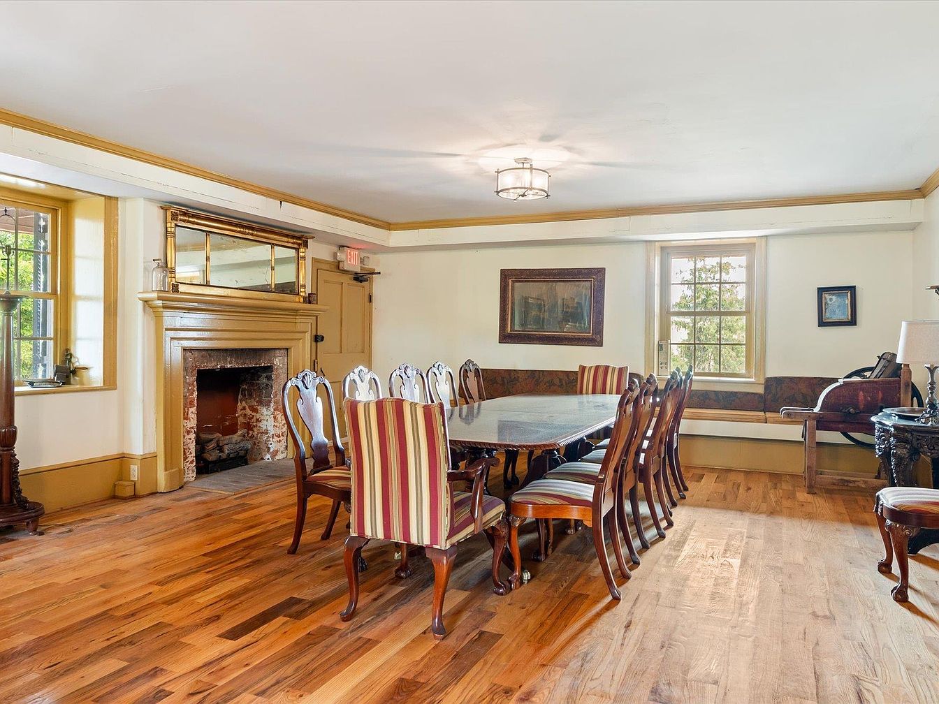 Warm hardwood floors and natural light create an inviting setting for gatherings at the large dining table that comfortably seats ten. Elegant chairs with striped upholstery add classic charm, while a traditional fireplace with a golden mantle anchors the room and enhances its cozy feel. Expansive windows with golden trim illuminate the space, highlighting both the period architectural details and the family-friendly bench window seat, perfect for casual conversation or extra seating during meals. Tasteful artwork, a vintage mirror above the fireplace, and thoughtfully placed accent furniture blend comfort with timeless sophistication, establishing an environment ideal for memorable family dinners and celebrations.