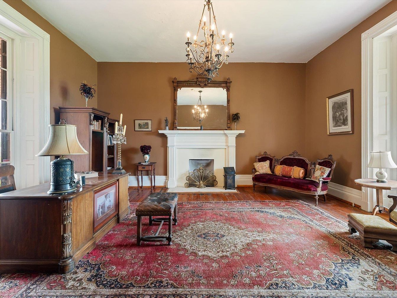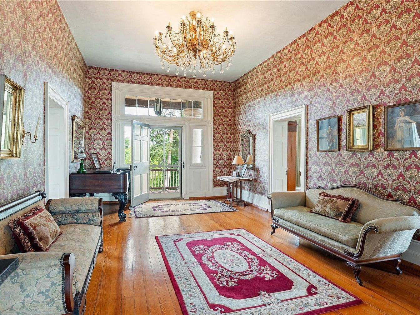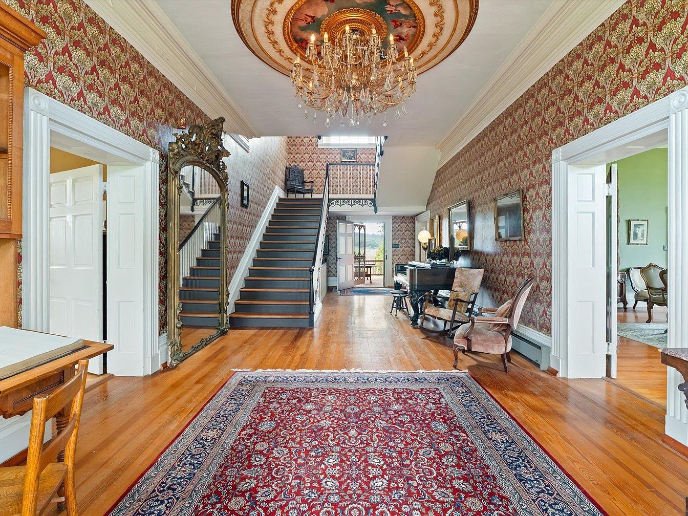 An expansive grand entry hall welcomes you with gleaming hardwood floors and intricate red-and-gold wallpaper, creating a warm and inviting atmosphere suitable for families. A rich Persian-style area rug centers the space, while a magnificent chandelier and elaborate ceiling medallion add an air of luxury and historical charm. Double doorways open to adjacent rooms, promising plenty of space for gatherings. A sweeping staircase with classic balustrades leads to the upper floor, and a gorgeous gilded mirror visually enlarges the hall. The antique upright piano and mixed vintage seating provide elegant yet functional decor ideal for socializing or quiet relaxation.