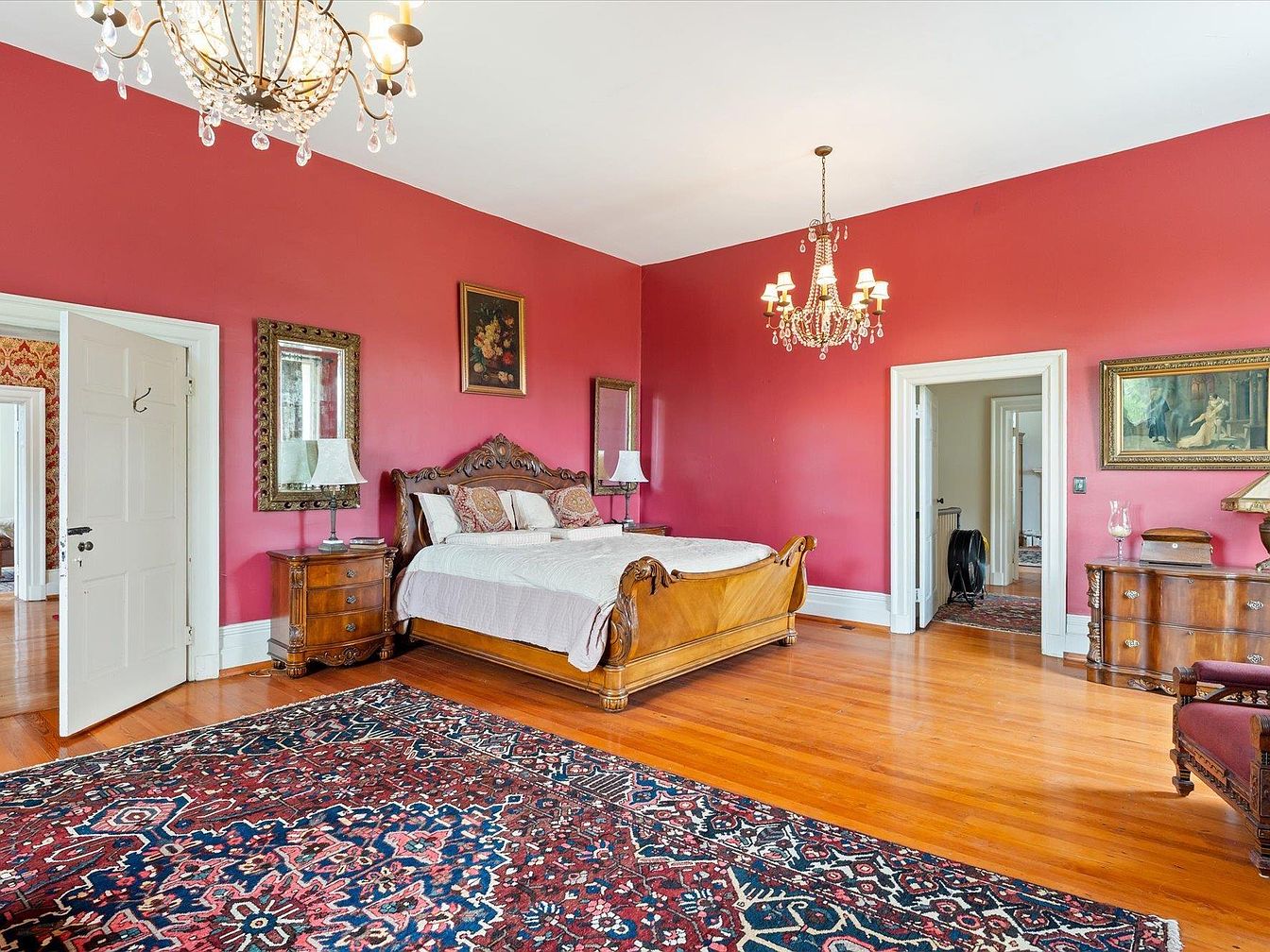 Spacious and inviting, the master bedroom features rich red walls that create a warm, welcoming atmosphere. Ornate décor is highlighted by an intricately carved wooden bed, classic nightstands with matching table lamps, and mirrored frames adding light and symmetry. Polished hardwood flooring paired with an oversized, vibrant area rug gives a touch of luxury and comfort, perfect for children to play on. Two elegant chandeliers provide soft lighting, and large doorways provide seamless flow to adjoining rooms, making the space practical for busy family life while maintaining a sense of refined sophistication. Carefully selected paintings and period furniture complete the timeless setting.