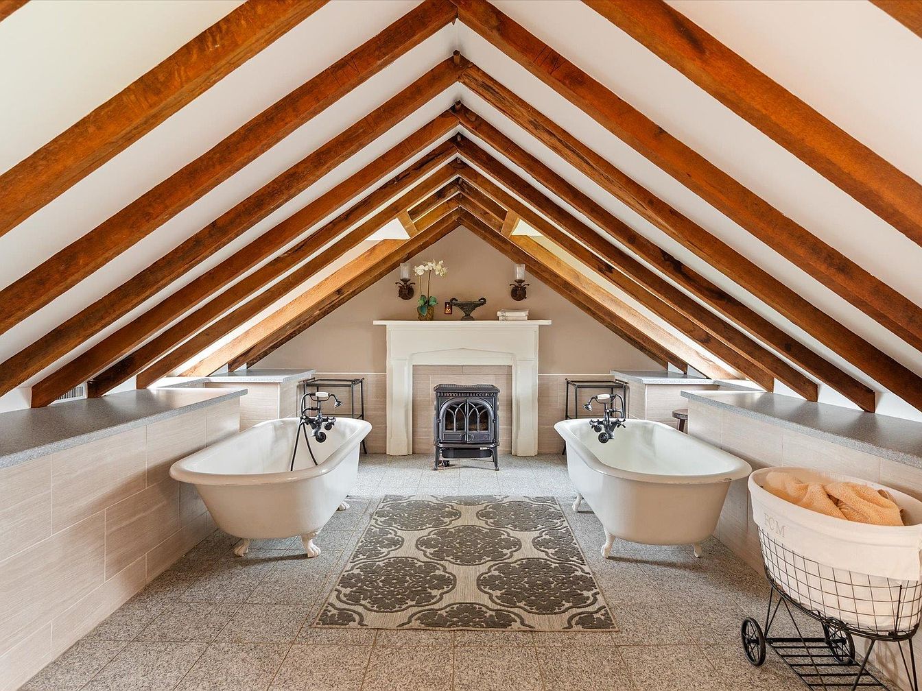This unique attic bathroom features exposed wooden beams that create a warm, rustic ambiance paired beautifully with neutral walls and tiled floors. Twin clawfoot bathtubs are positioned side by side, providing an inviting space for family members to relax together. Natural light pours through the side windows, illuminating the soft beige and cream color palette. A decorative rug and a classic white fireplace add charm and elegance, while a wood stove lends extra coziness. Ample ledges run along both sides, perfect for toiletries, towels, or keeping an eye on little ones during bath time. Family-friendly and serene, this bathroom inspires relaxation.