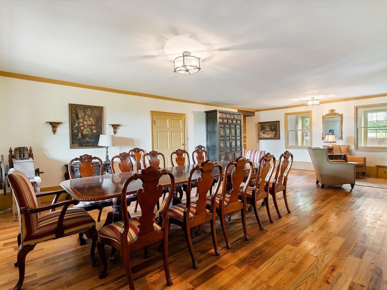 This spacious dining room balances traditional elegance with family functionality, featuring a long wooden dining table surrounded by intricately carved chairs with striped upholstery, perfect for hosting large family meals or gatherings. The light golden trim around windows, doors, and ceiling adds warmth to the creamy walls, while hardwood floors bring a sense of timeless comfort. A separate seating area with cushioned armchairs and a loveseat creates an inviting corner for conversation or relaxing after a meal. Decorative touches include classic artwork, a large cabinet, and statement lighting, all contributing to a welcoming atmosphere for families of all sizes.