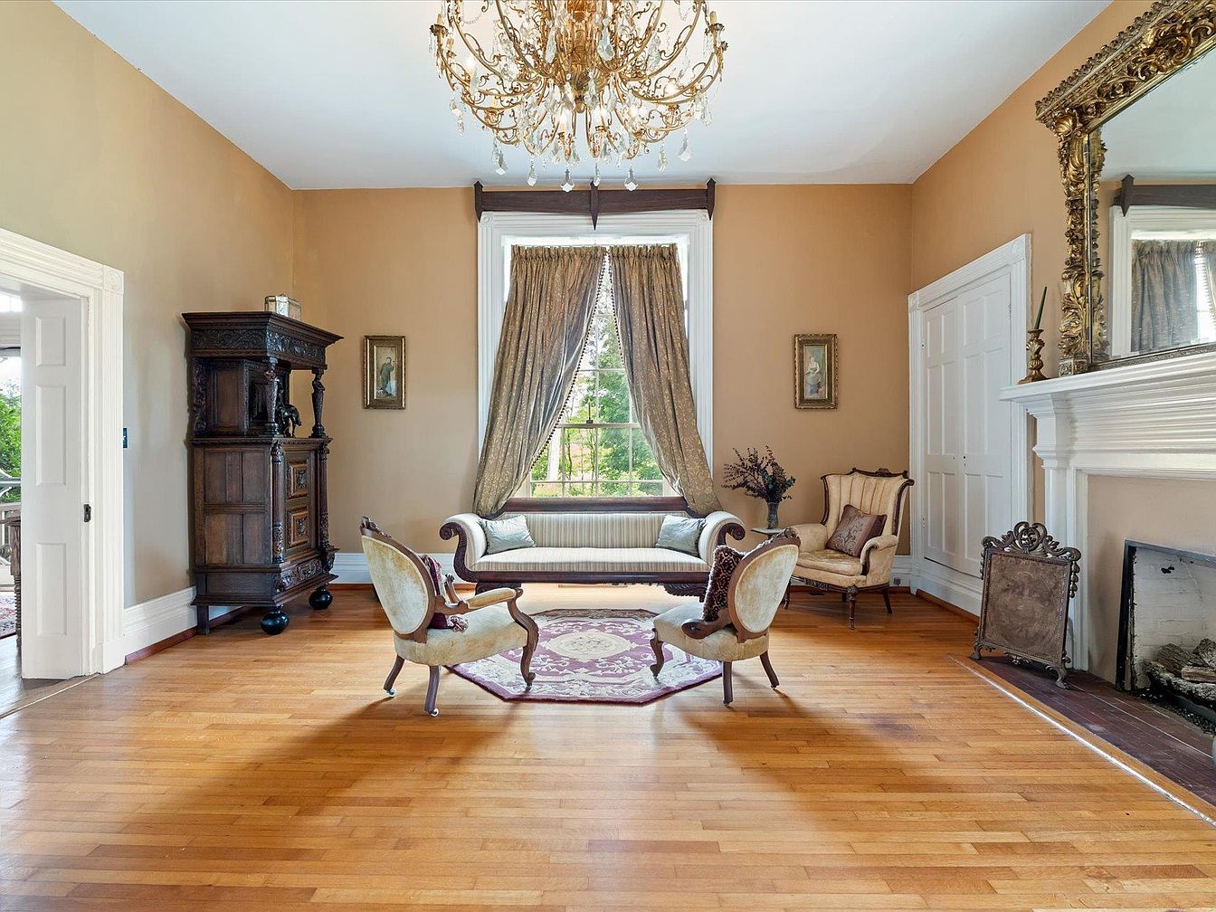 A spacious, light-filled living room boasts traditional elegance with its rich honey-toned hardwood floors and soft, warm beige walls. Centered under a sparkling crystal chandelier, a classic seating arrangement with antique armchairs and a settee invite gatherings and family connection. Intricate wood furniture, including an ornate armoire and a detailed fireplace mantel with a gold-framed mirror, add historic character. The large central window, dressed in luxurious drapes, bathes the room in natural light while offering tranquil garden views. Artful touches like vintage framed artwork and delicate décor create a refined yet welcoming space ideal for family relaxation and entertaining.