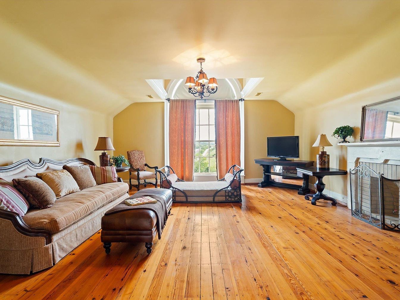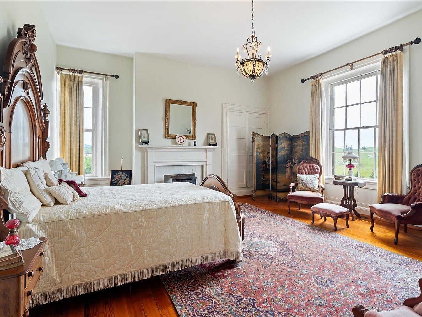 A spacious and sunlit master bedroom features grand, tall windows dressed in soft beige curtains, flooding the room with natural light and highlighting sweeping views of the countryside. Warm wooden floors are complemented by a richly patterned area rug that ties together the elegant furnishings. The dramatic carved wood headboard and vintage chairs add historic charm, while the fireplace with a mirror above brings a cozy focal point. Family-friendly in its inviting seating area, plenty of floor space, and calming cream color scheme, the room encourages relaxation and togetherness, blending antique character with comfort and sophistication.