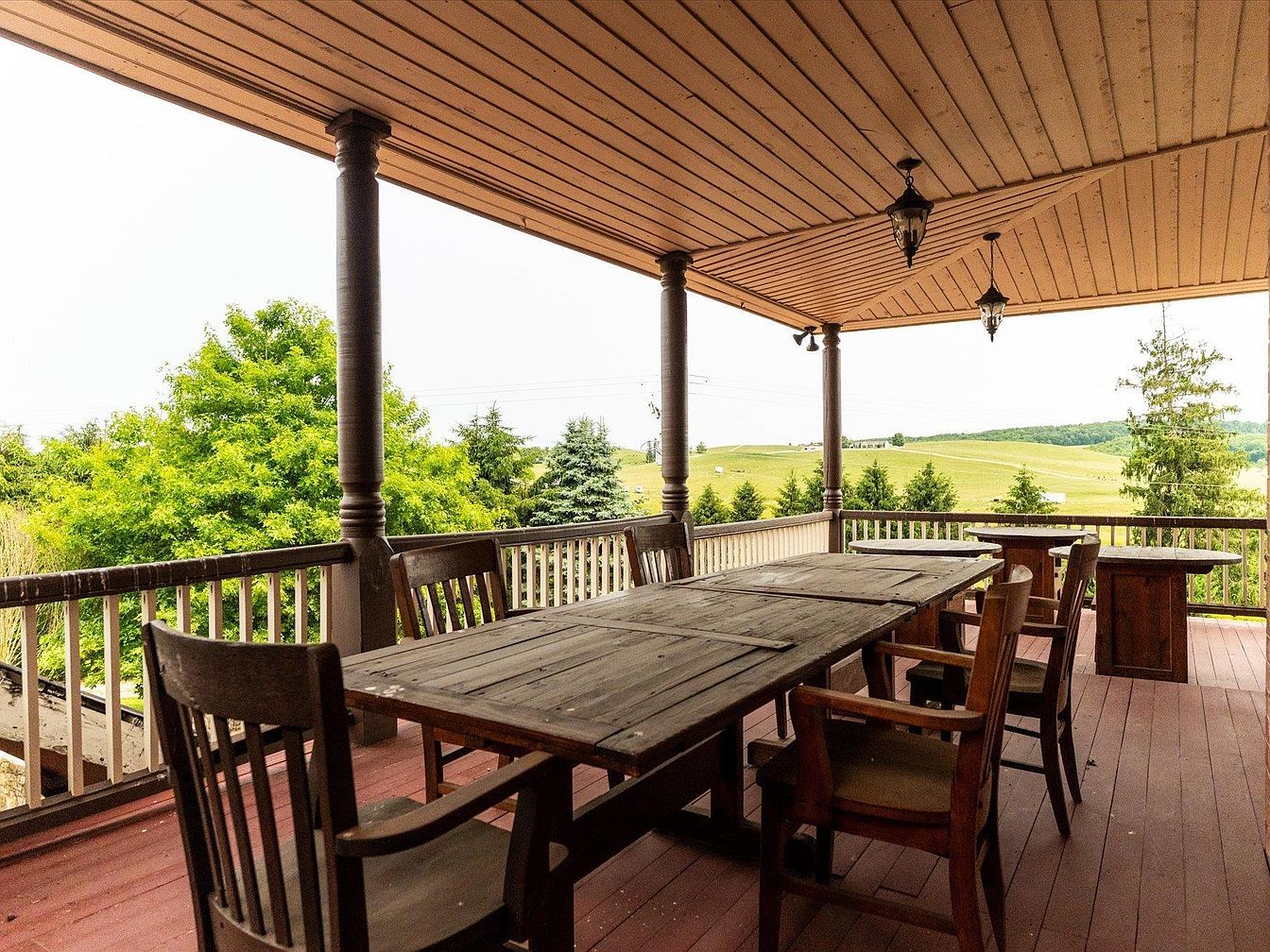 A spacious covered porch designed for outdoor dining and relaxation, this area features a long rustic wooden table surrounded by matching chairs, comfortably seating a large group for family meals or gatherings. The warm wood tones of the ceiling, flooring, and furniture create an inviting and cohesive look that blends seamlessly with the surrounding countryside. Sturdy columns offer architectural character, and classic lantern-style lights add a touch of vintage charm. The open railing design allows for unobstructed views of rolling green hills and mature trees, making this porch ideal for family activities, entertaining guests, or simply enjoying peaceful rural vistas together.