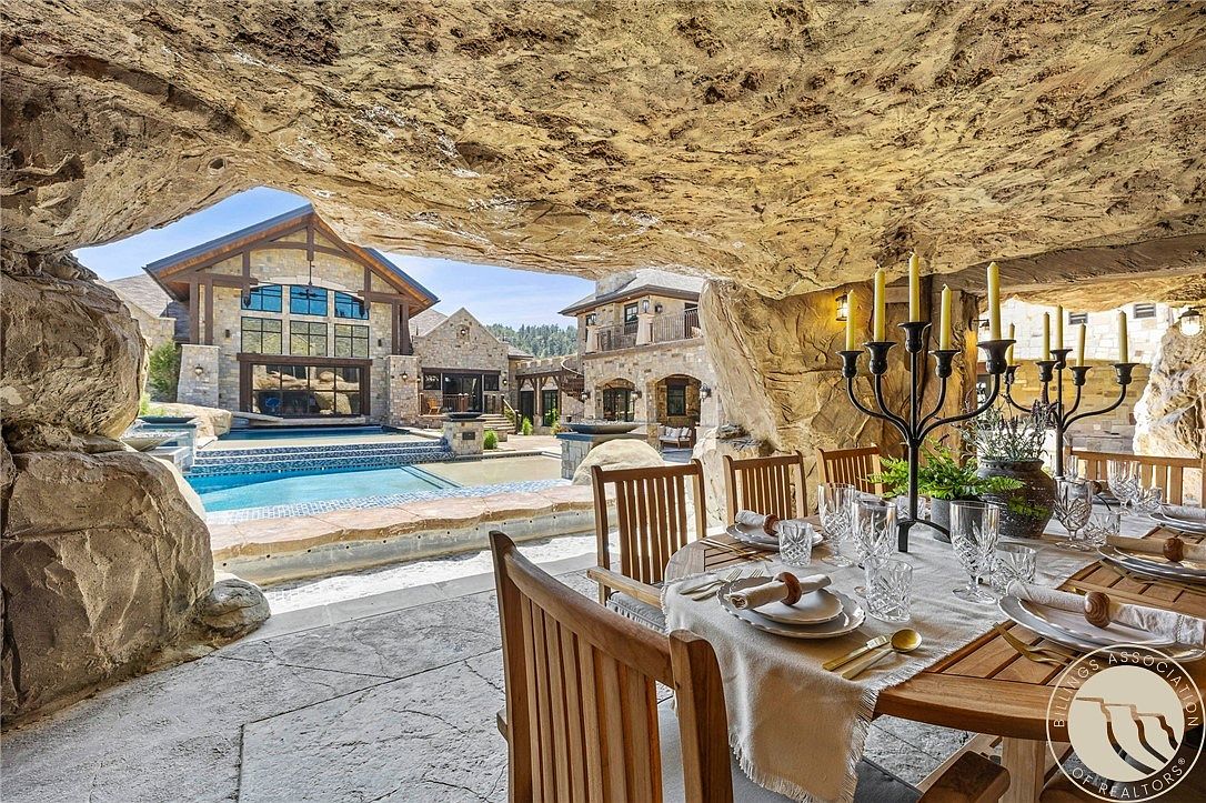 A unique poolside dining area is nestled beneath a dramatic, cavernous rock overhang, offering both shelter and an adventurous ambiance for family meals or gatherings. The stone table is elegantly set with fine glassware, white linens, and a striking black candelabra centerpiece, creating a sense of refined rustic charm. Natural light pours into the space, highlighting the textures of the surrounding rock and the panoramic view of the backyard pool and impressive stone home. Comfortable wooden chairs and family-style seating make this space perfect for socializing. It’s an inviting retreat for kids and adults alike, blending nature and luxury living.