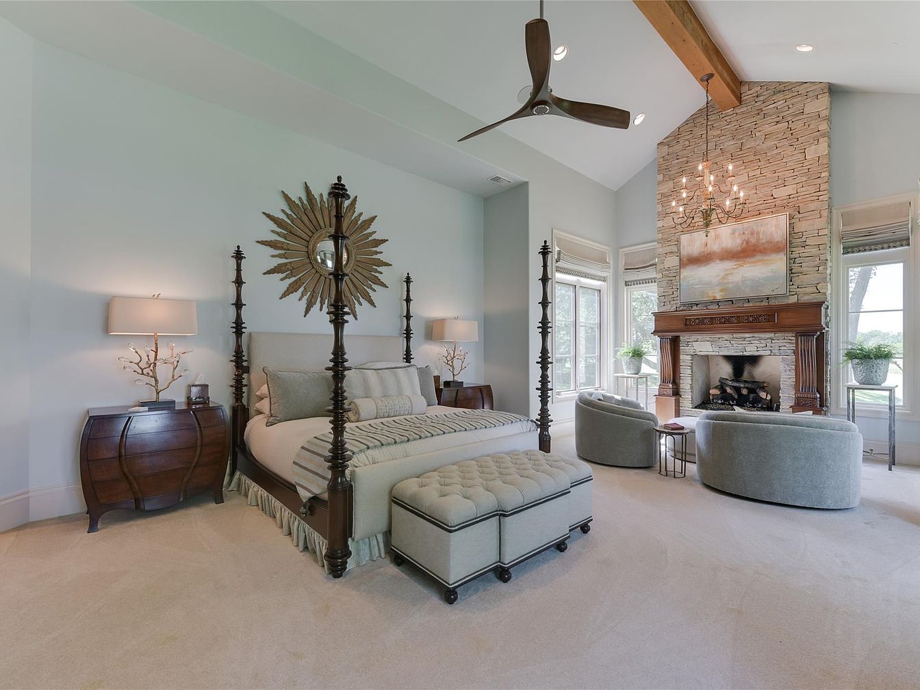 This spacious master bedroom combines comfort and elegance, featuring a grand four-poster bed as the centerpiece, flanked by sculpted wooden nightstands with soft, ambient lamps. A cozy sitting area with two plush, curved armchairs and a tufted ottoman sits in front of a beautiful stone fireplace crowned with a chandelier, offering the perfect reading or relaxation spot. Abundant natural light streams through large corner windows, highlighting the serene neutral palette of cream carpets and pale blue walls. Warm wooden beams add a rustic touch, and the overall setup ensures a family-friendly, inviting atmosphere ideal for unwinding together.