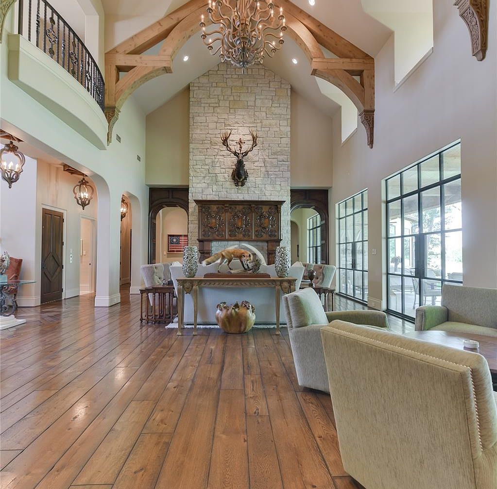 Soaring cathedral ceilings with exposed wooden beams create a dramatic, open atmosphere in this refined living room. Wide plank hardwood floors flow across the spacious layout, highlighting cozy seating arrangements perfect for family gatherings. The impressive stone fireplace serves as a striking focal point, complemented by intricate woodwork and decorative accents like the mounted deer head. Neutral-hued furniture paired with soft green armchairs invites relaxation, while large grid-patterned windows bathe the room in natural light and offer scenic views outdoors. Elegant arched doorways and a curated console table add sophistication, blending warmth and grandeur for a welcoming, family-friendly retreat.