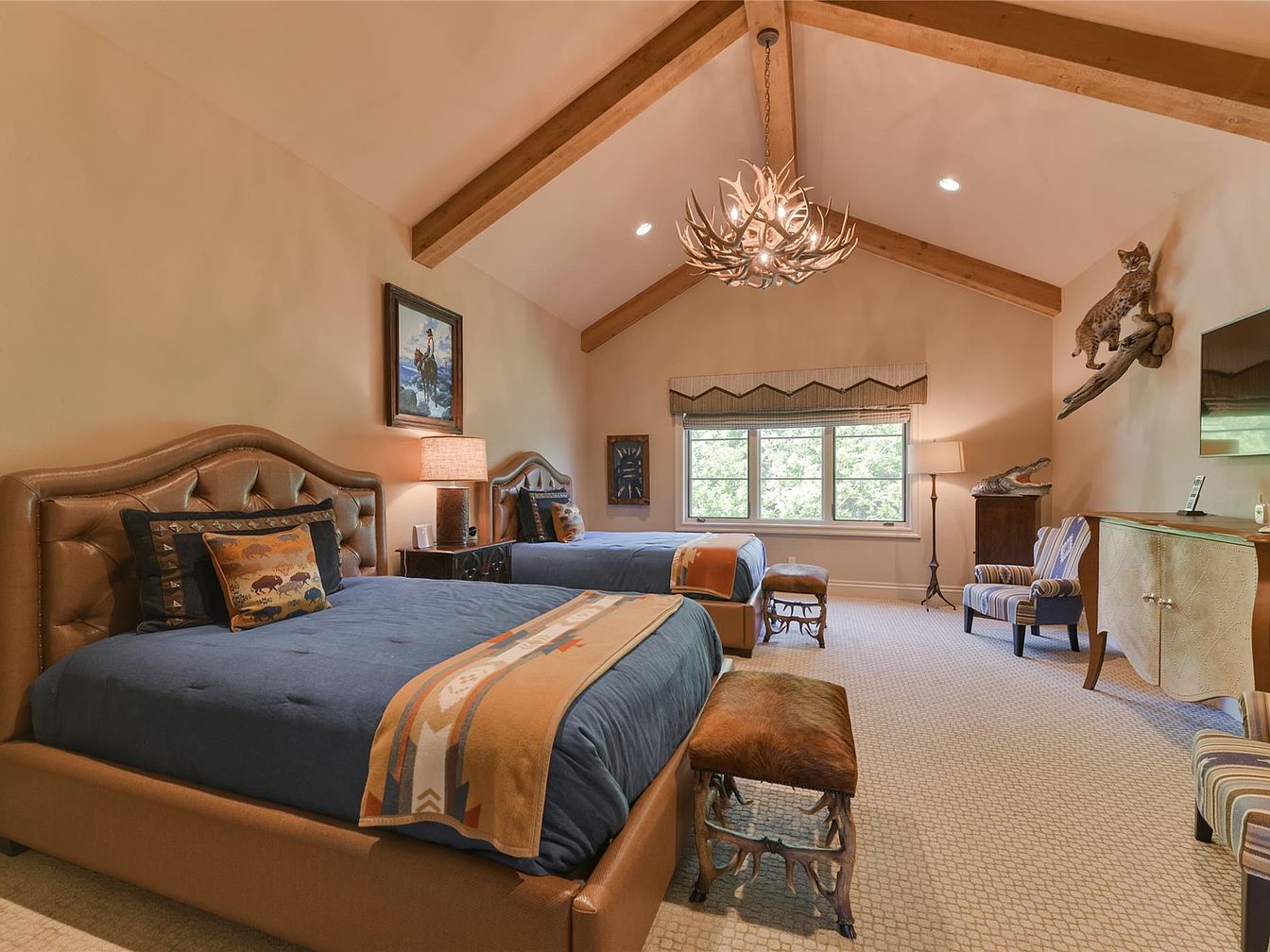 Warmth and coziness define this spacious bedroom, accentuated by exposed wooden beams and antler-inspired chandelier. Two plush double beds with tufted headboards and Southwestern bedding offer plenty of space, making it ideal for families or guests. Earthy tones of tan and blue create a soothing atmosphere, complemented by playful wildlife-themed pillows and art. The large window lets in natural light, with a patterned valance adding a tailored touch. Family-friendly seating includes striped armchairs, and the room is enhanced with unique rustic accents, like fur-topped stools and mounted decor, making it both inviting and memorable.