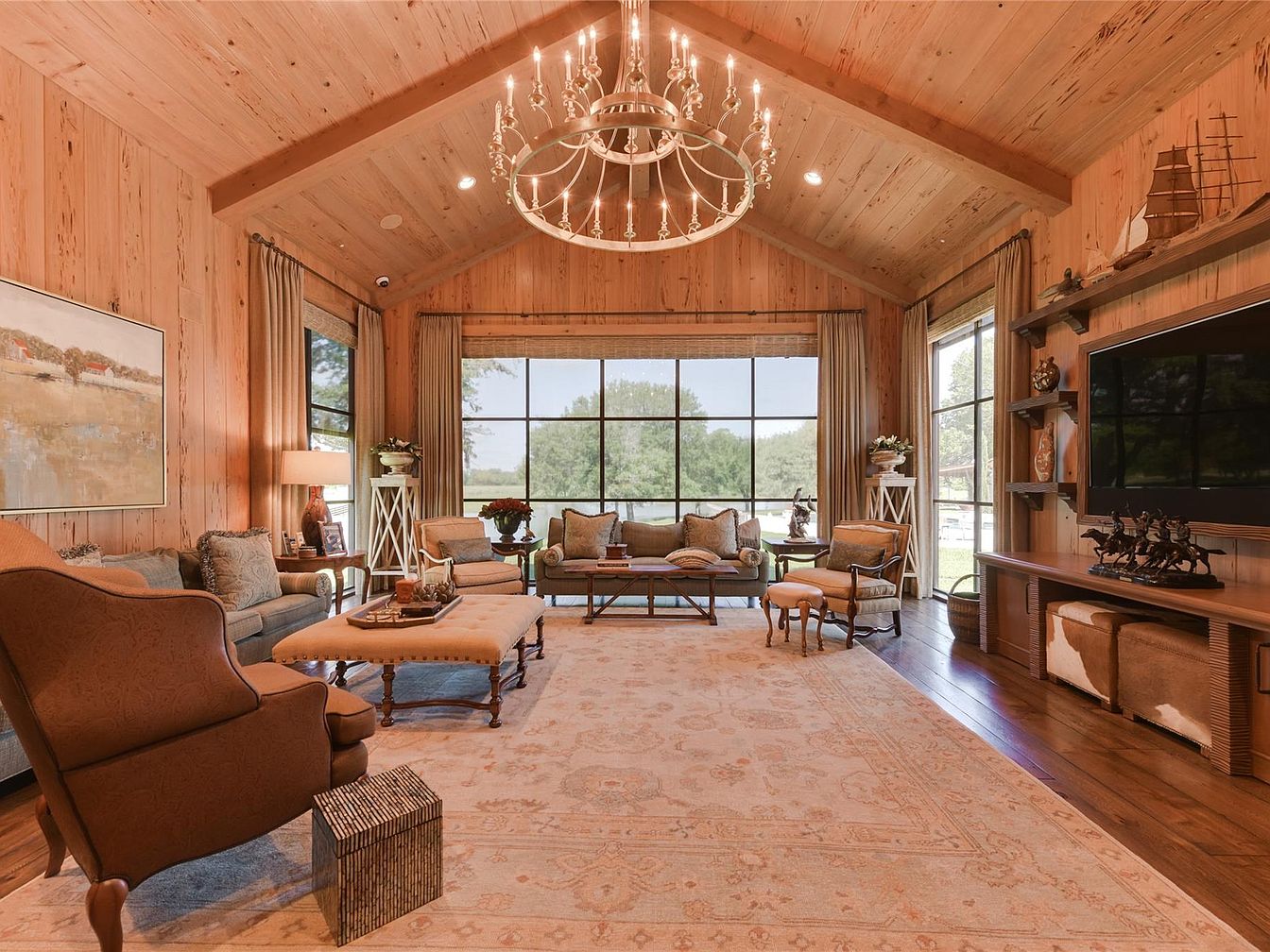 Warm wood paneling extends across walls and ceiling, creating a welcoming, cabin-inspired atmosphere perfect for families. Large windows bring in natural light and offer serene views, making the space feel open yet intimate. Earth-toned furnishings, including plush sofas and classic armchairs, are arranged for easy conversation and gatherings. A generous area rug adds softness for children to play on, while a grand chandelier adds elegance overhead. Shelving with thoughtful nautical decor, soft drapes framing the windows, and a substantial ottoman contribute to the comfort and style, balancing functionality with a rustic, upscale charm ideal for both relaxing and entertaining.