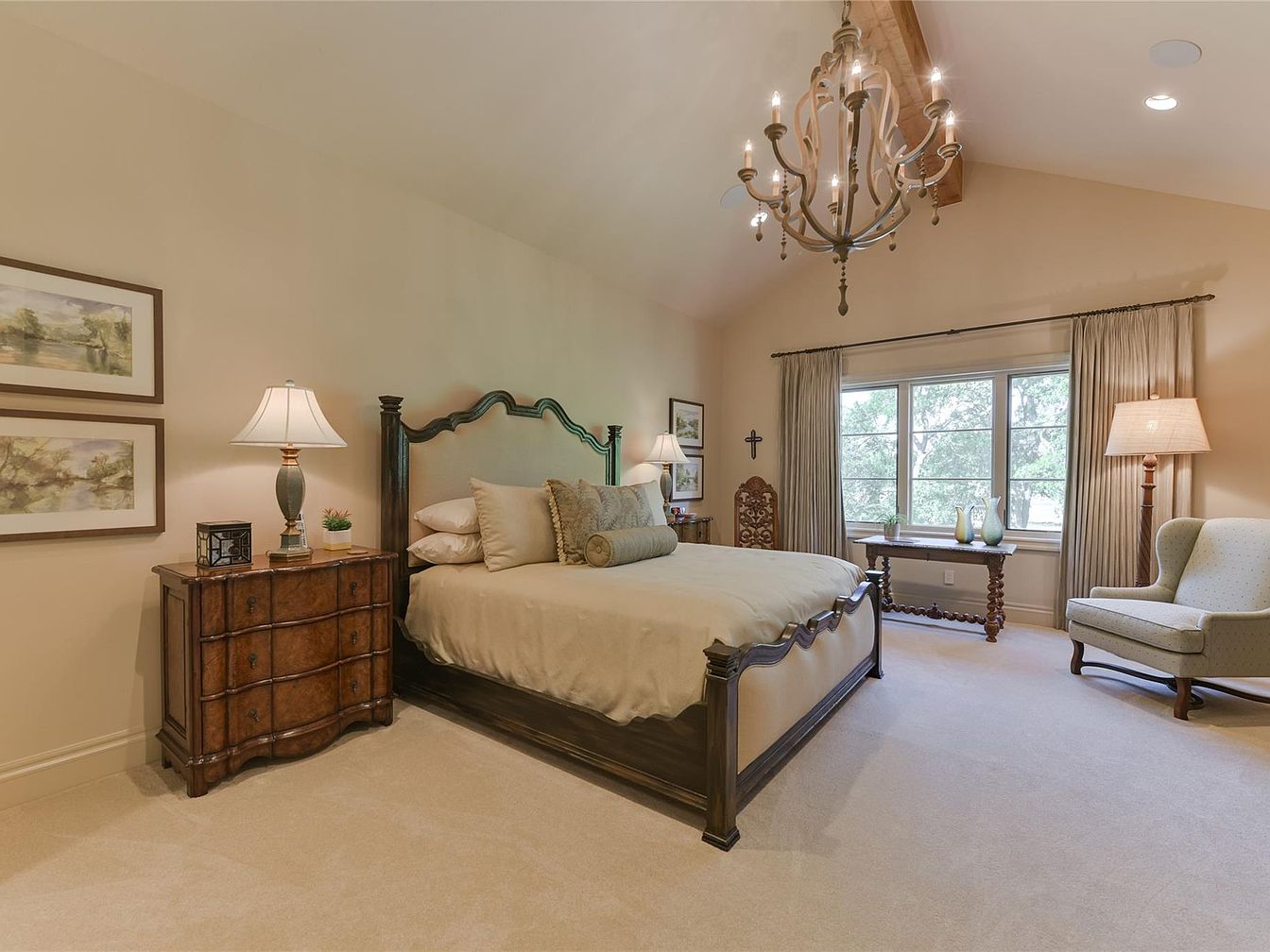 This spacious master bedroom exudes warmth with its neutral color palette and inviting decor. Soft beige walls and carpeting create a cozy ambiance, complemented by rich wood furniture and subtle green accents in the armchair and bed pillows. A grand chandelier and exposed wooden beam enhance the ceiling, adding an elegant touch. Large windows allow natural light to flood the room, while heavy drapes offer privacy when needed. The room includes child-friendly, soft flooring and ample open space, making it perfect for family life. Framed artwork and tasteful accessories provide a finishing touch that feels both refined and comfortable.