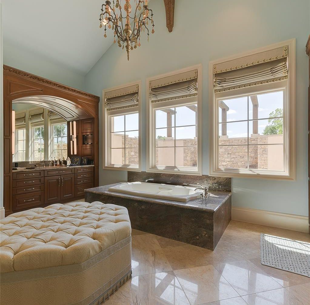 High ceilings with exposed wooden beams and an elegant chandelier create a sense of grandeur in this spacious bathroom. A large soaking tub is set under three oversized windows, inviting in natural light while maintaining privacy with Roman shades. The marble flooring and tub surround blend seamlessly with the soft pastel wall color, creating a serene atmosphere. A plush, tufted ottoman offers comfort for dressing or relaxation, and the extensive wood cabinetry provides ample storage for a family. The vanity area features intricate woodwork and generous counter space, perfect for morning routines or self-care. An inviting, family-friendly, timeless design.
