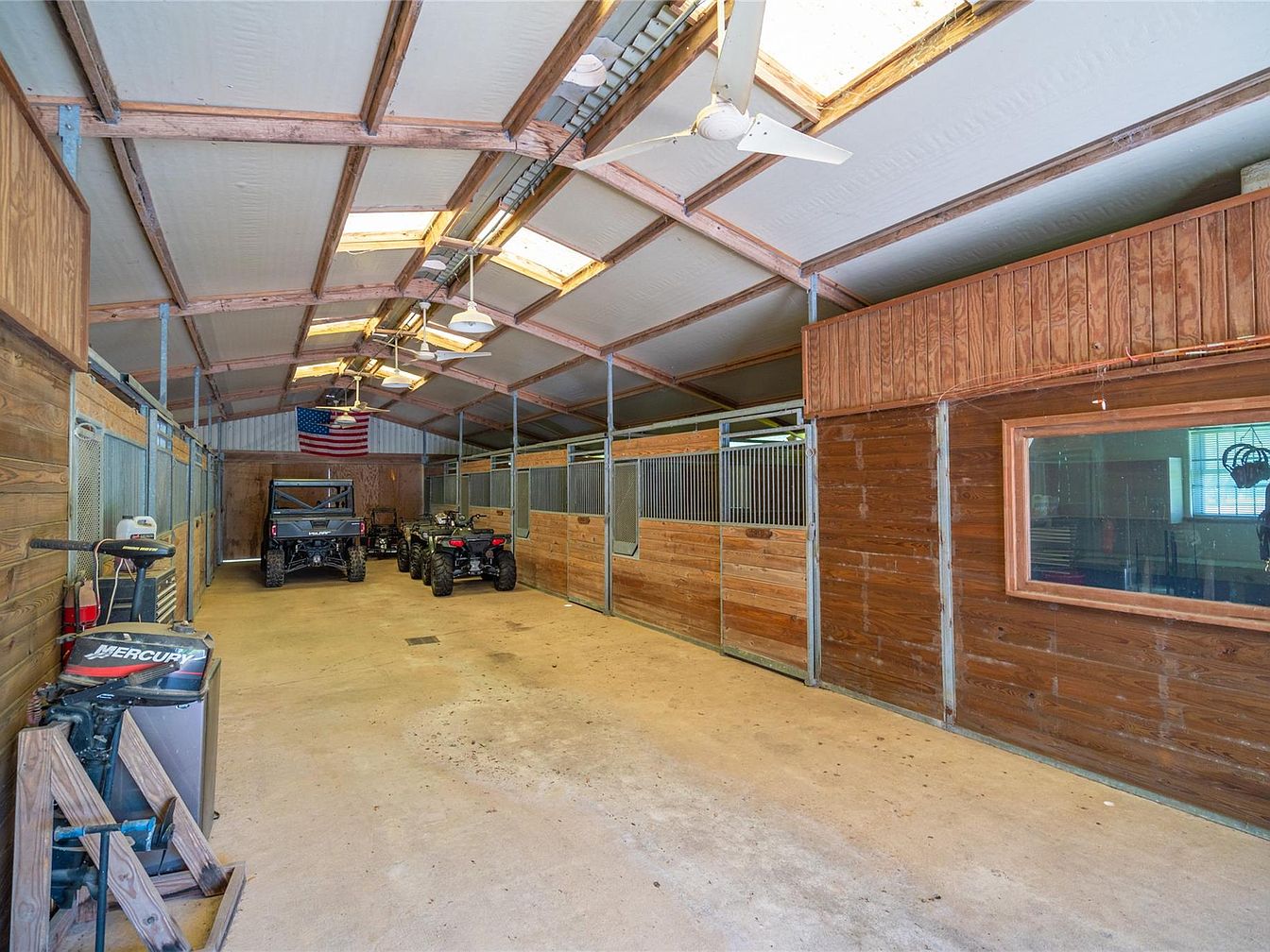 A large, multi-functional barn with high ceilings, exposed wooden beams, and plenty of natural light filtering through skylights. The layout features several horse stalls with sturdy metal railings and wooden panels, ensuring safety and comfort for animals while providing clear visibility. One side houses utility vehicles and ATVs, making it ideal for an active, outdoorsy family. The concrete flooring adds durability for both livestock and equipment. Natural wood tones throughout create a warm, rustic ambiance, complemented by a large American flag adding a touch of Americana charm. This space seamlessly blends practicality with inviting, family-friendly usability.