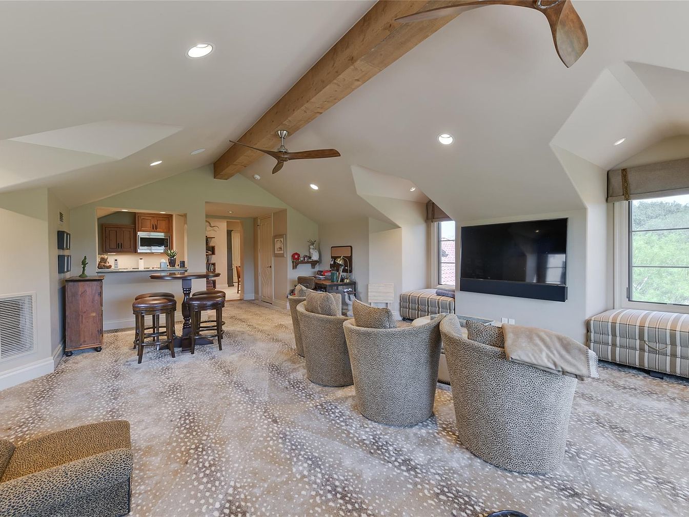 Spacious family loft designed for relaxation and togetherness, featuring cozy swivel armchairs and a large wall-mounted television set within a light-filled room. Exposed wooden ceiling beams add rustic charm, while plush carpet in a contemporary animal print creates a soft, inviting space for kids and adults alike. Window benches with plaid upholstery offer additional seating and reading nooks. A casual breakfast or game bar with high stools sits near the open kitchenette, promoting effortless family gatherings. Soft neutral-toned walls and natural light from large windows enhance the airy, comfortable, and family-friendly atmosphere.