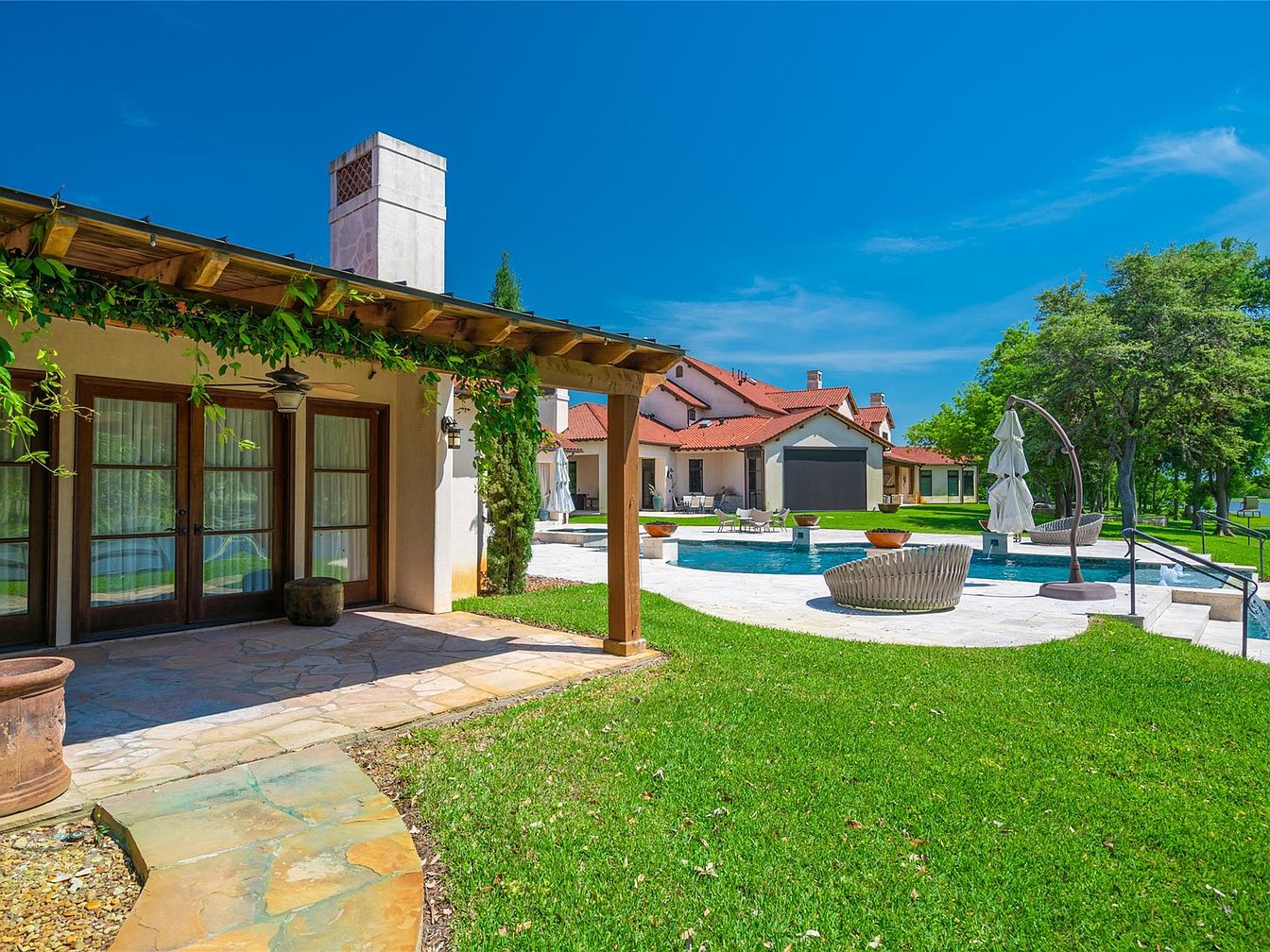 A spacious backyard oasis features a sparkling pool surrounded by lush green grass and mature trees, ideal for relaxing or entertaining. The inviting patio area, shaded by a charming wooden pergola draped with greenery, extends from the house through a set of tall French doors. Comfortable, contemporary woven outdoor lounge chairs are perfectly positioned for both sun and shade. The neutral stonework and creamy exterior walls complement the warm wood elements, while the terracotta roof tiles add a touch of Mediterranean style. This outdoor living space blends beauty and functionality, creating a family-friendly environment for gatherings, leisure, and play.