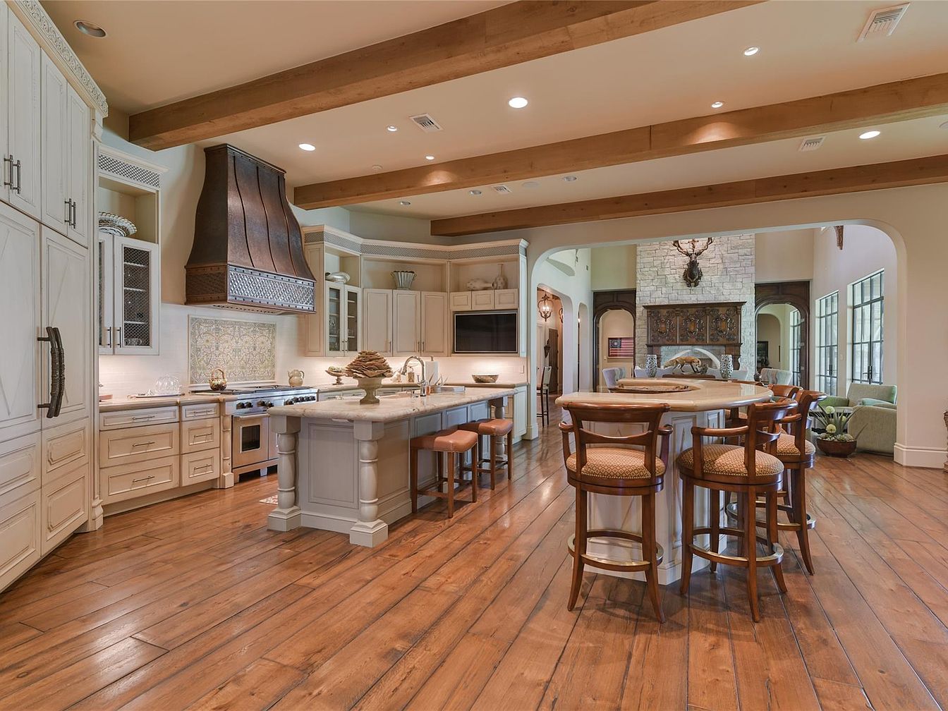 A spacious kitchen showcases rustic elegance with wide plank wooden floors, exposed wood ceiling beams, and creamy cabinetry for a warm, inviting atmosphere. Central to the kitchen is a large gathering island with plush, upholstered bar stools, perfect for family meals or casual conversations. The range hood features a dramatic copper finish above a patterned tile backsplash, adding a touch of sophistication. Abundant cabinetry, open shelving, and a double island design maximize functionality, making it a versatile heart of the home. The open-plan layout seamlessly connects the kitchen to a cozy living area, ideal for family life and entertainment.