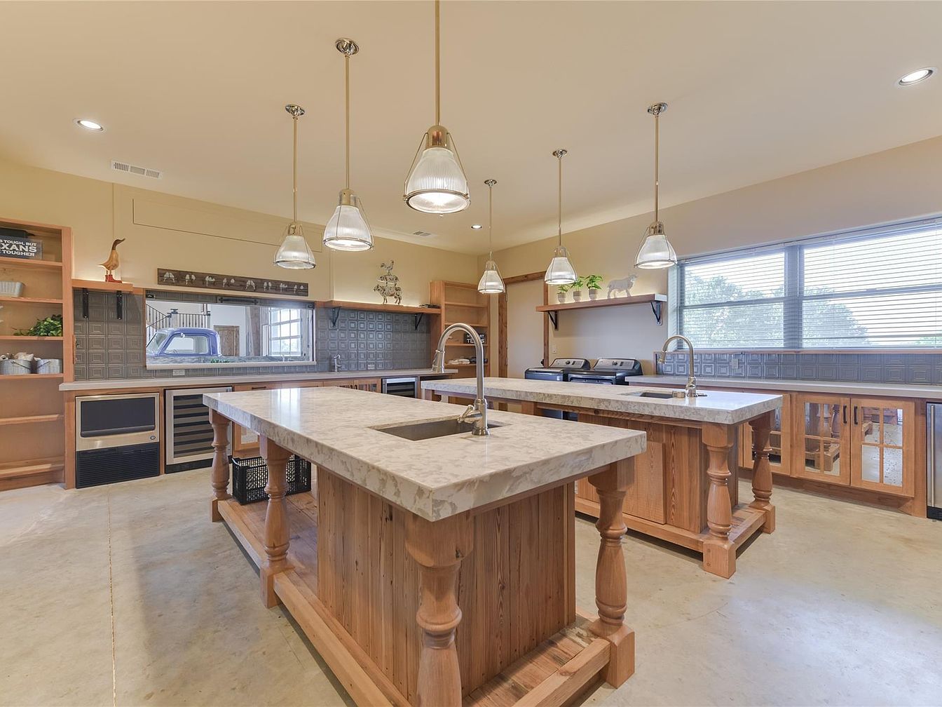 Spacious and inviting, this kitchen features dual island counters with elegant marble tops and natural wood bases that offer ample workspace for meal prep and family gatherings. Warm neutral tones blend seamlessly with the beige walls and light stone flooring, creating a comfortable, laid-back ambiance. Generous cabinetry, open shelving, and under-counter appliances offer practical family-friendly storage while decorative pendant lights above each island add a touch of sophistication. Large windows allow abundant natural light, and the long counter along the wall provides extra room for cooking and entertaining. Modern details and rustic finishes combine for a functional, welcoming space.